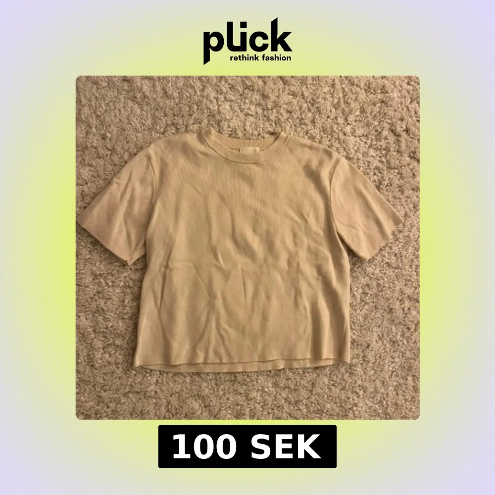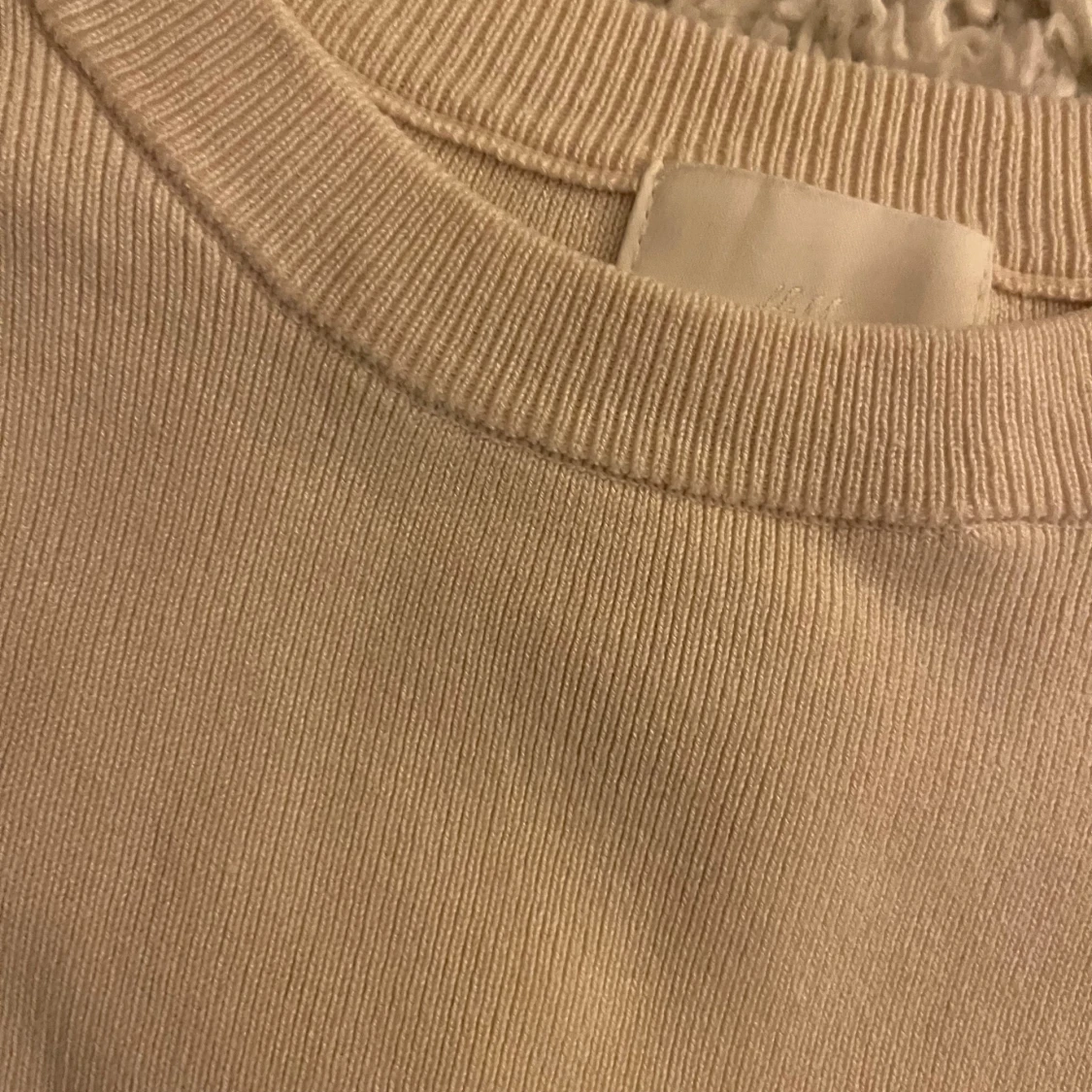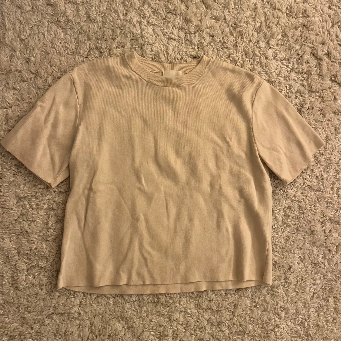 En stilren beige t-shirt från H&M med ribbad struktur och klassisk rund hals. T-shirten är kortärmad och har en enkel, clean look som passar till det mesta. Perfekt för dig som gillar en basic vibe och vill ha något som funkar året runt. Ganska liten i storleken
