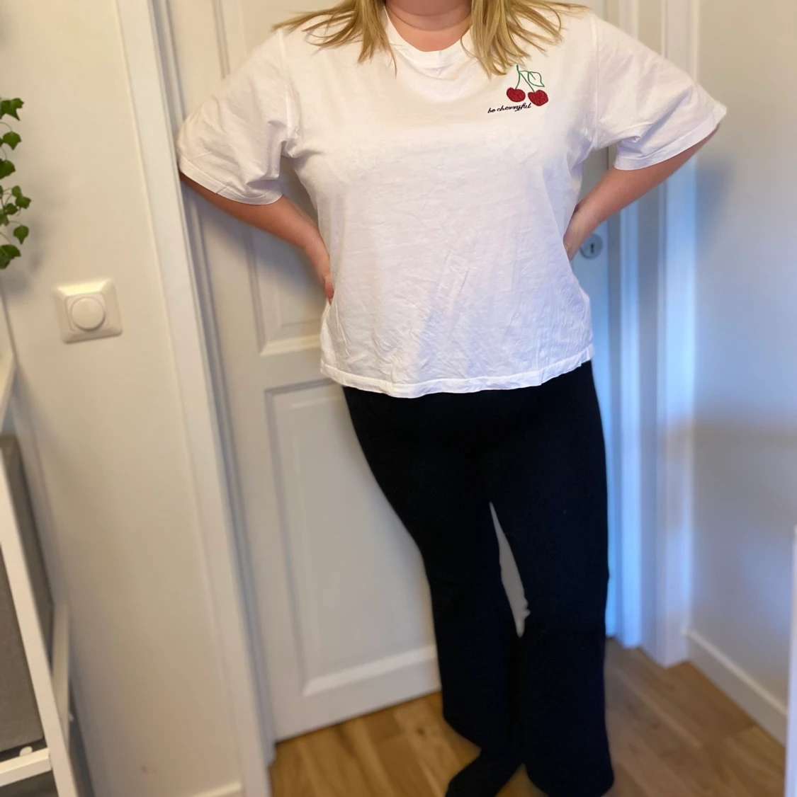 Enkel T-shirt med körsbärsmotiv, bra i storleken. Frakten ingår i priset. Modellen på första bilden har oftast M/L