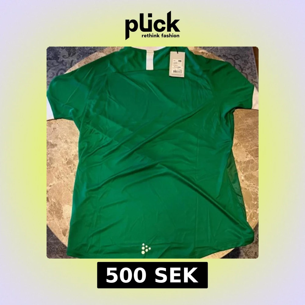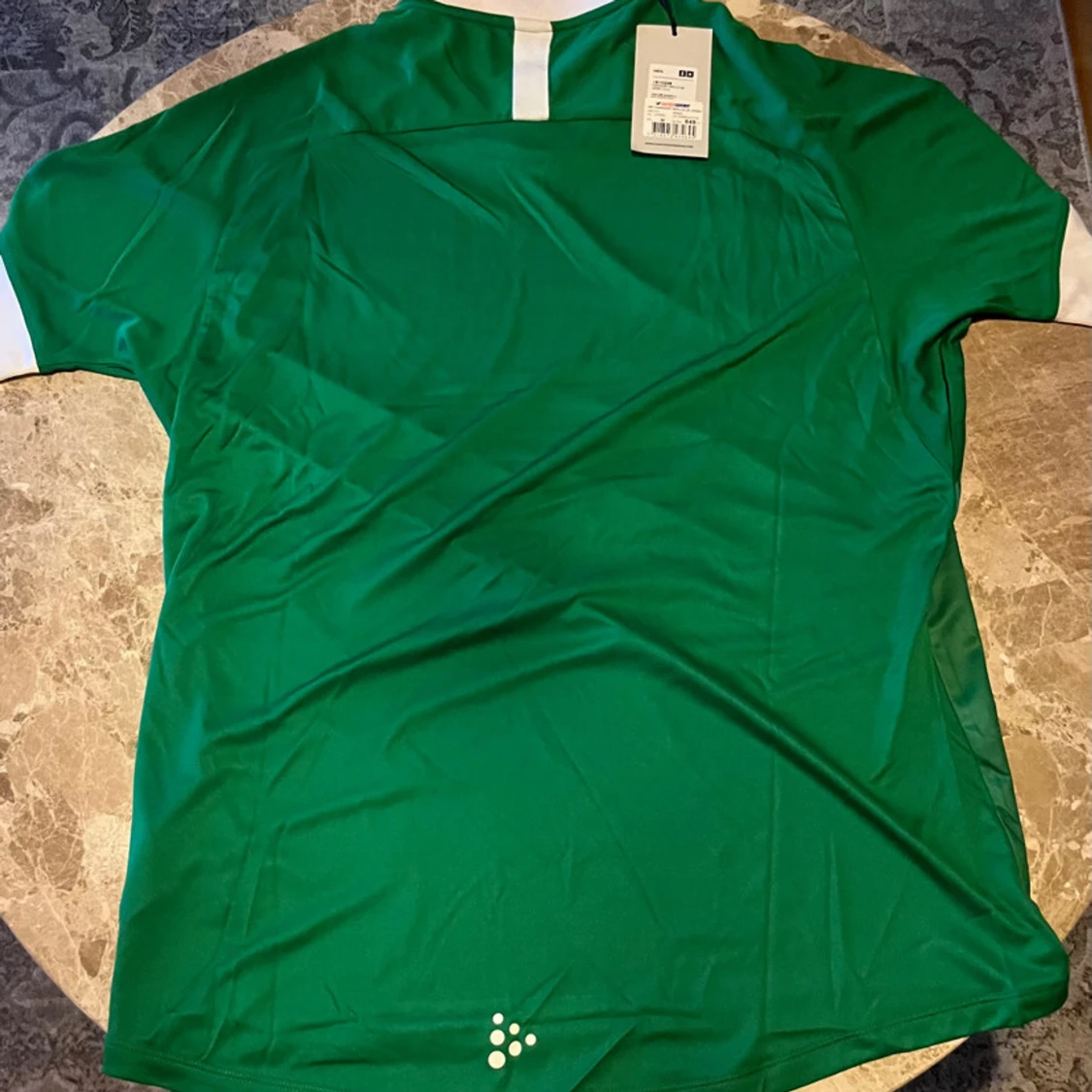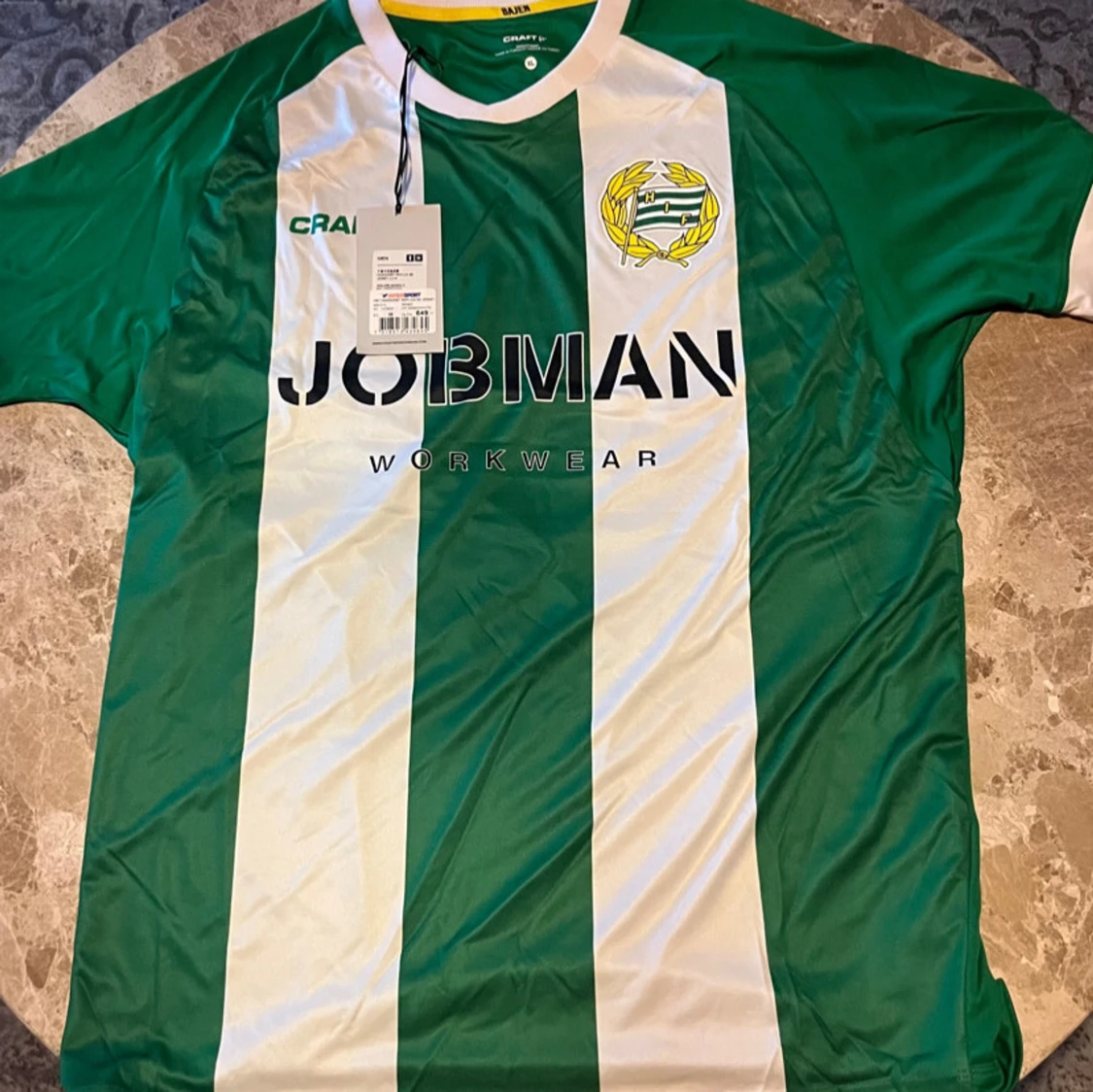 Säljer en officiell Hammarby fotbollströja från Craft i grönt och vitt med breda vertikala ränder. Tröjan har korta ärmar, vit krage och Hammarbys klubbmärke på bröstet. Materialet är lätt och andas, perfekt för match eller träning. Sponsorer tryckta på framsidan.