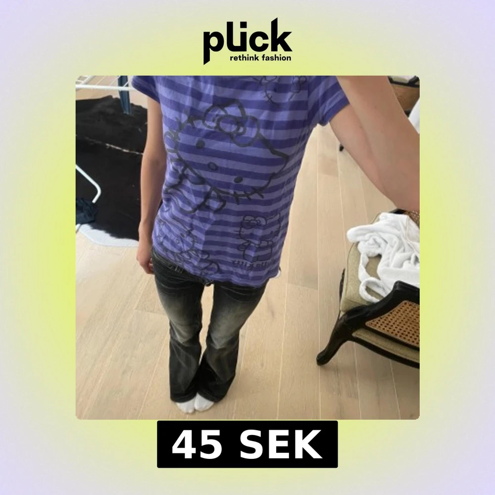Säljer en lila och mörklila randig t-shirt med Hello Kitty både fram och bak.