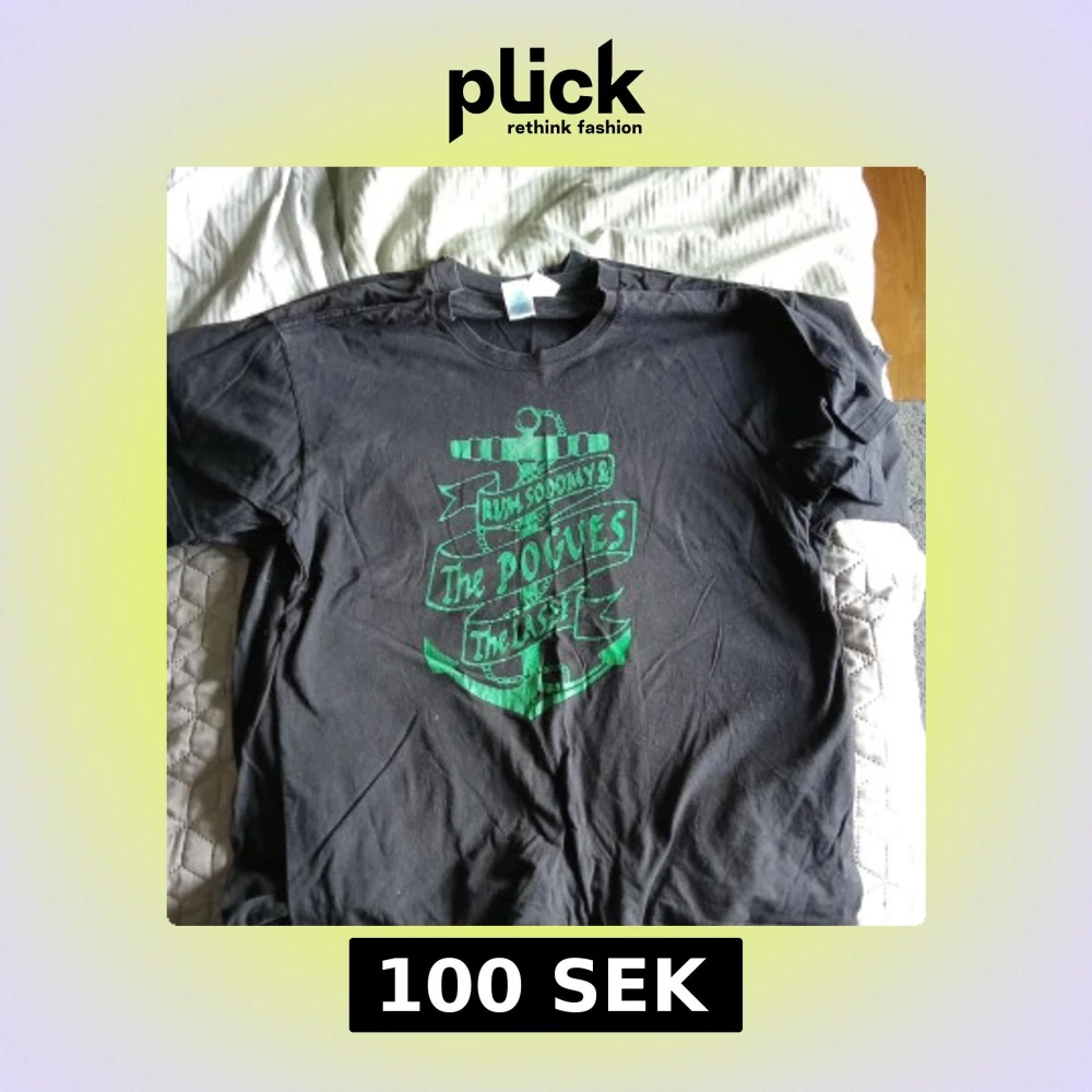 Säljer en svart t-shirt med tryck i grönt och rött. T-shirten har ett ankarmotiv och texten 'Rum Sodomy & The Lash'. Perfekt för fans av the pogues