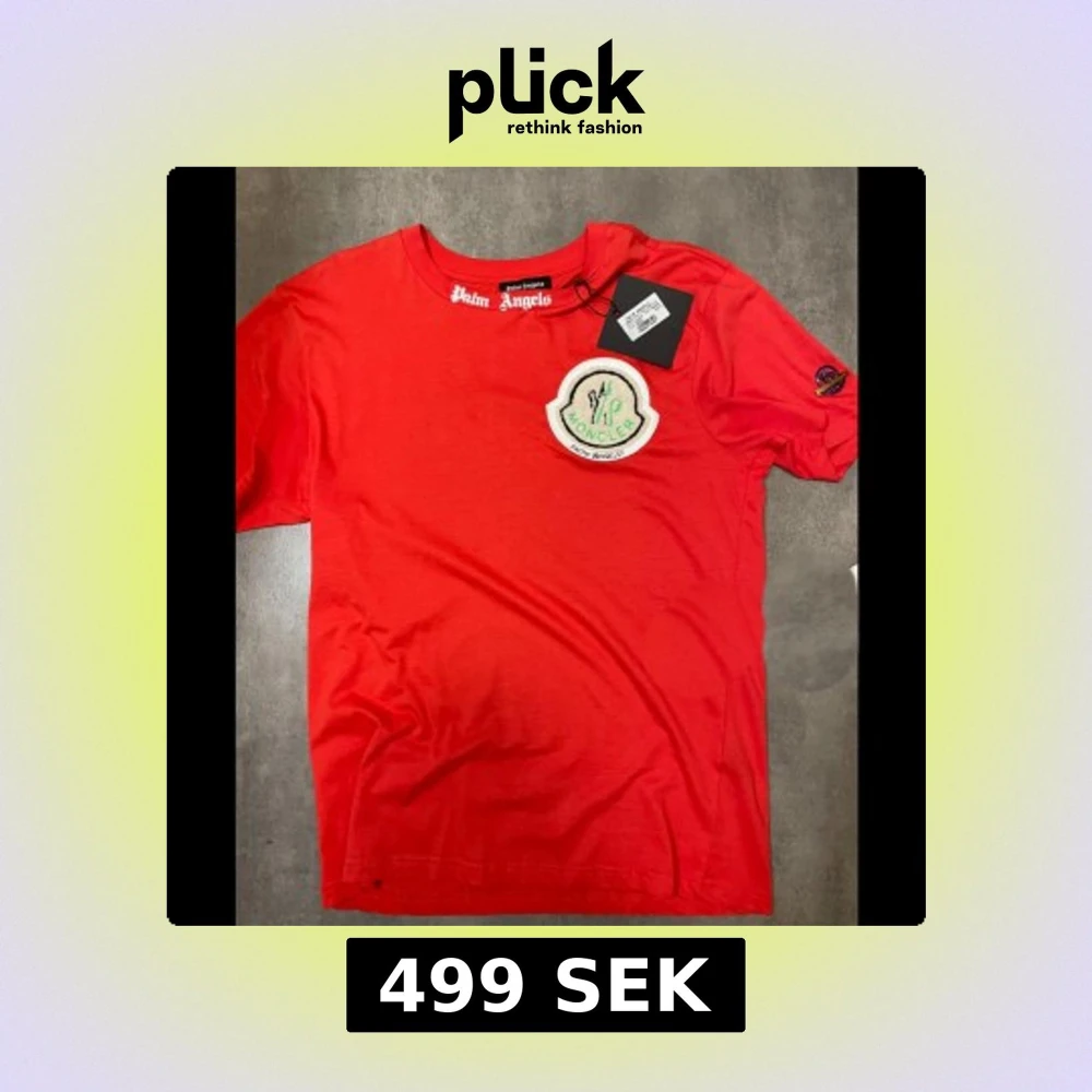 Snygg röd t-shirt från Palm Angels x moncler med ett stort tryck på ryggen och en broderad patch på bröstet. T-shirten har korta ärmar och en rund halsringning. Perfekt för dig som vill sticka ut med stil!