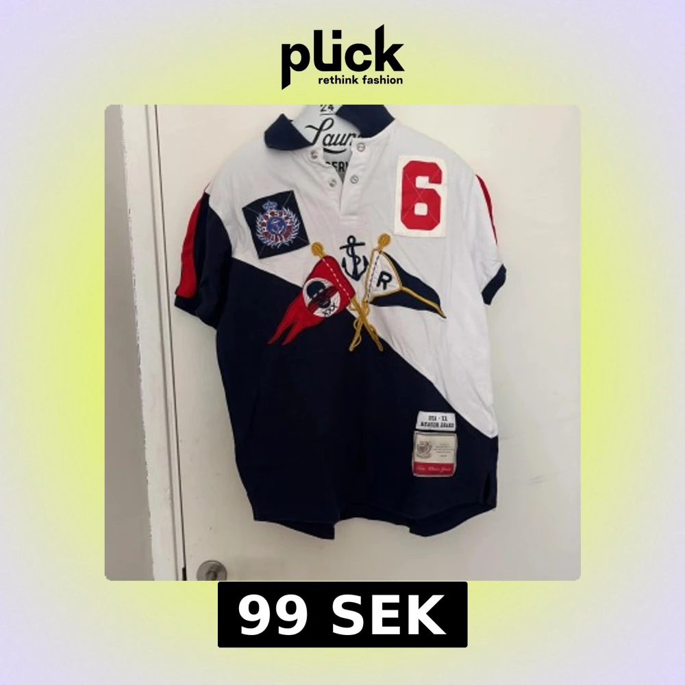 Säljer en snygg piké t-shirt från Reason i vitt, marinblått och rött. T-shirten har korta ärmar, krage och flera broderade detaljer samt tryck, bland annat flaggor och siffran 6. Perfekt för dig som gillar sportig stil.