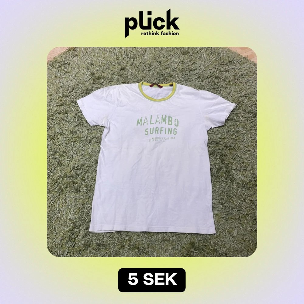 Säljer en vit t-shirt från Zara Jeans med texten 'Malambo Surfing' i grönt på framsidan. T-shirten har en gul och grön ribbad krage och är kortärmad. Perfekt för en avslappnad sommarlook eller en dag på stranden. 🏄♂️