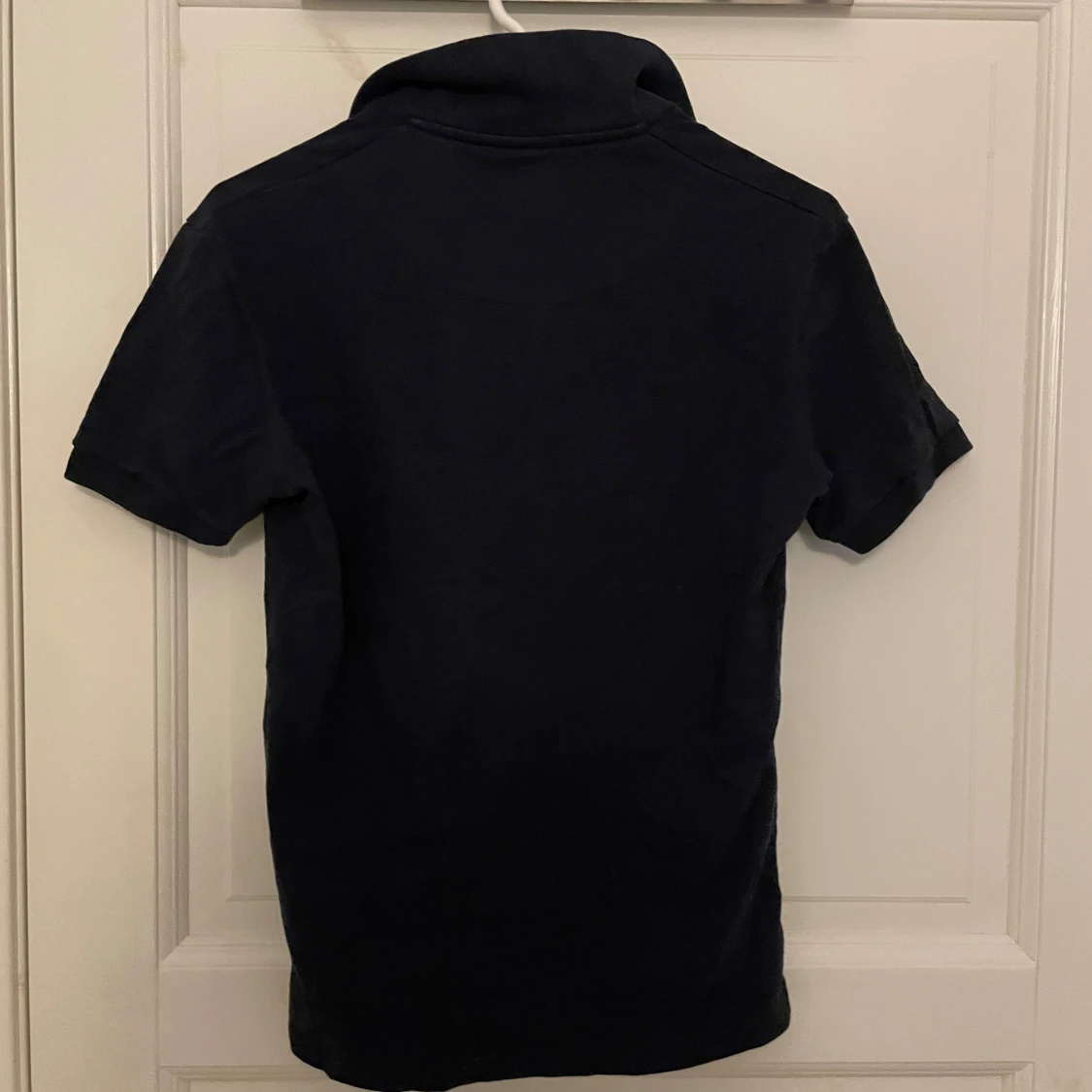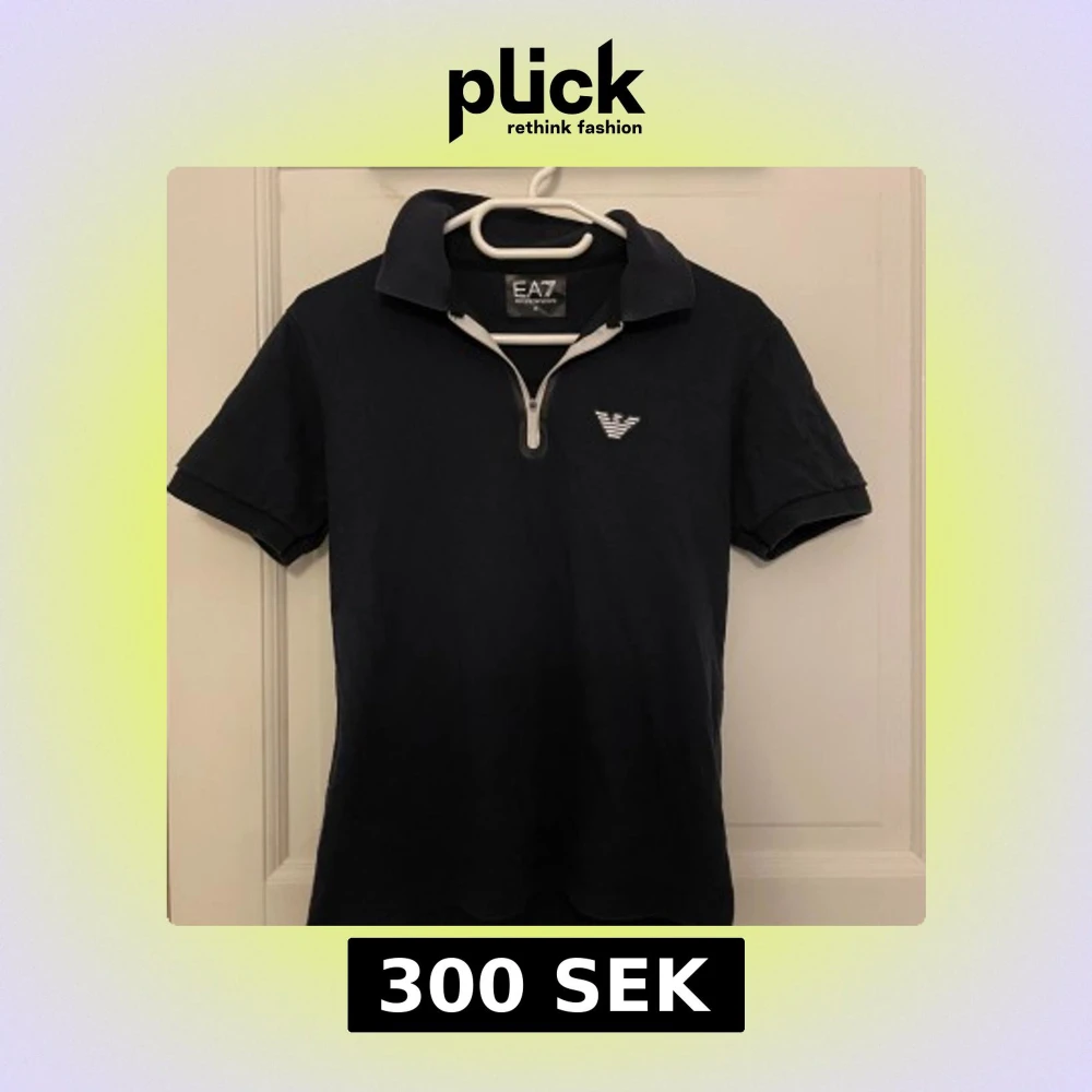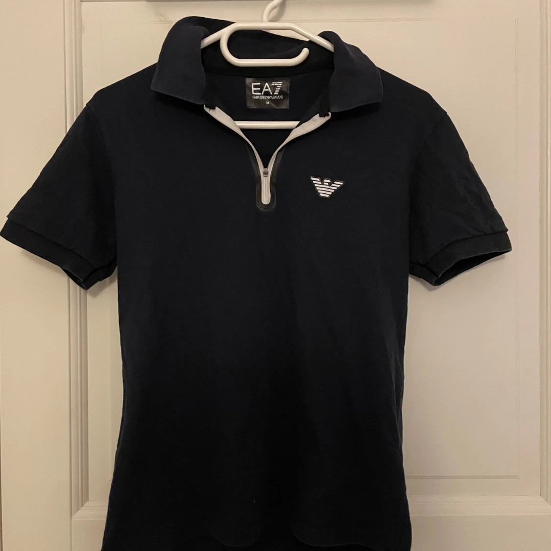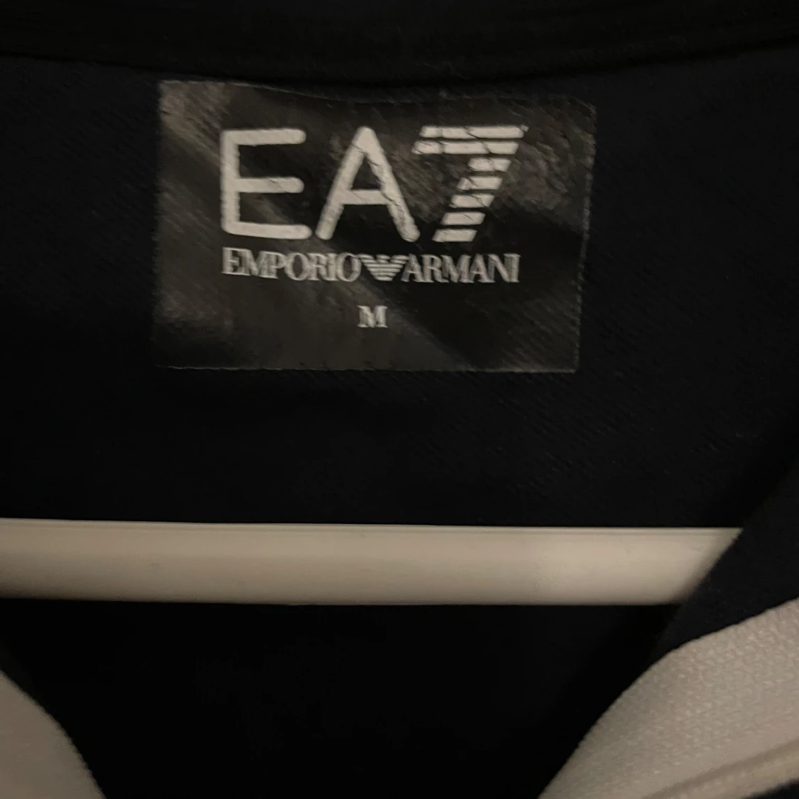 Snygg mörkblå t-shirt från EA7 Emporio Armani med kort dragkedja vid halsen och vit logga på bröstet. Klassisk krage och korta ärmar. Perfekt för en stilren och sportig look.