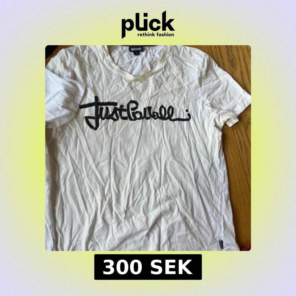 Säljer en vit t-shirt från Just Cavalli med svart handskriftsliknande logga på bröstet. T-shirten har rund halsringning och är tillverkad i mjuk bomull. Perfekt för en stilren och avslappnad look. Den är äkta!! Pris kan diskuteras