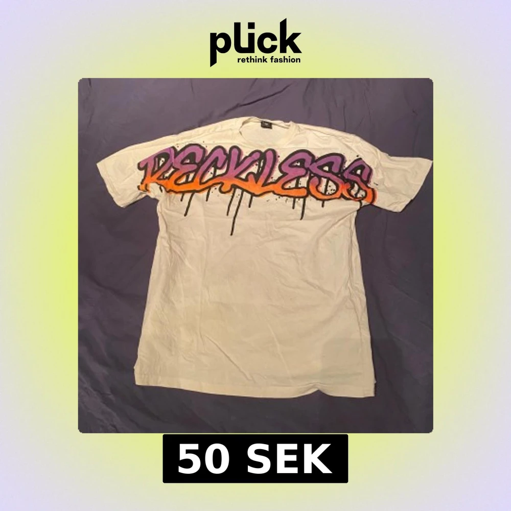 Vit t-shirt från FSBN med stort graffiti-inspirerat tryck i lila, orange och svart där det står 'RECKLESS' över bröstet. Modellen är relaxed fit och har korta ärmar. Perfekt för en streetwear-look.
