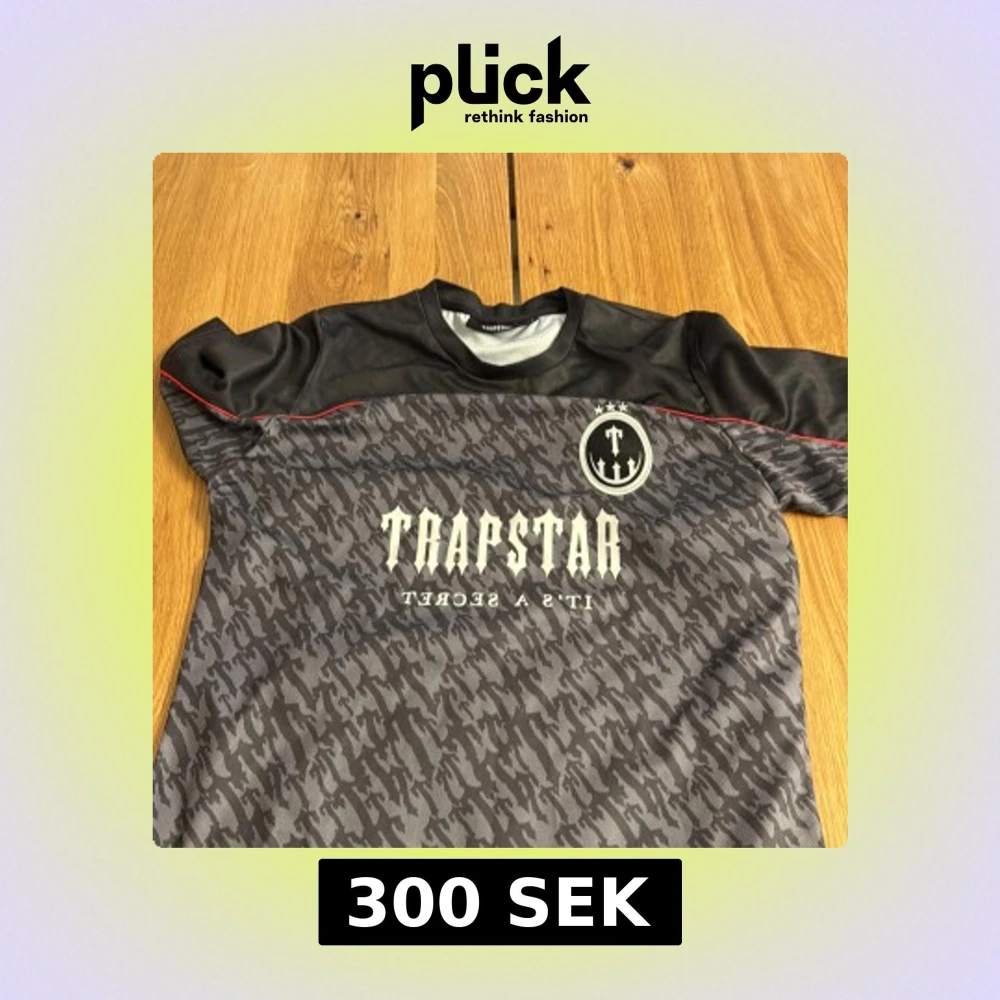 Säljer en svart och grå kortärmad fotbollströja från Trapstar med kamouflagemönster, stora vita tryck både fram och bak samt röd detalj vid axlarna. Tryck med Trapstar-logga och siffran 22 på ryggen.