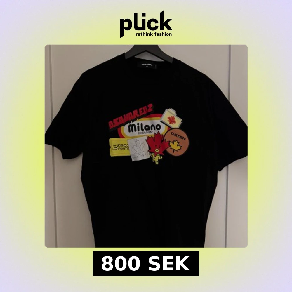 Säljer en svart t-shirt från Dsquared2 i storlek XL men passar Medium & Large. Framsidan har färgglada tryck med texten 'Milano Dreamin', Dsquared2-logga och olika patch-inspirerade motiv. Perfekt för dig som gillar streetwear och statement-plagg.