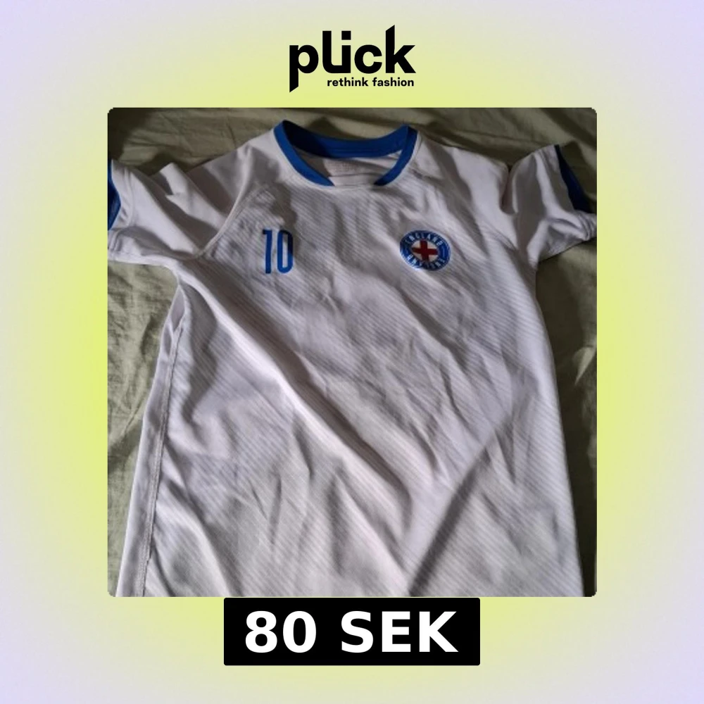 Säljer en vit fotbollströja från H&M med blå detaljer. Tröjan har nummer 10 och texten 'England' på ryggen. Den har korta ärmar och en rund halsringning med blå kant. Perfekt för fotbollsfans!