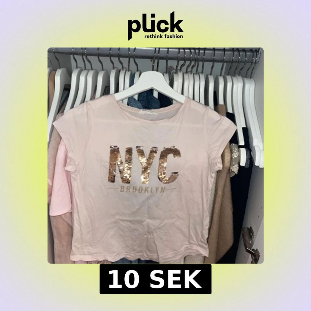 Ljusrosa t-shirt från H&M med korta ärmar och glittrig NYC-text i guldiga paljetter❤️Under står det Brooklyn i tryck. Skriv för mer bilder eller prisförslag🫰🏼🫰🏼❤️