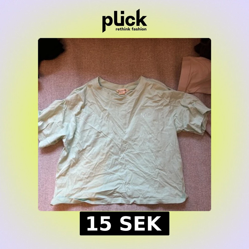 Säljer en mintgrön t-shirt från H&M med ett stilrent NYC-tryck på bröstet. T-shirten har en avslappnad passform och korta ärmar, perfekt för en casual look. Passar ungdomar i storlek 158/164. Andra bilden visar verklighetstrogen färg.