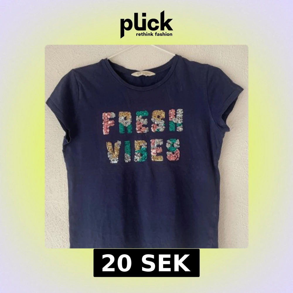 Snygg mörkblå t-shirt från H&M med texten 'FRESH VIBES' i färgglada paljetter på bröstet. T-shirten har korta ärmar och är gjord i mjuk bomull. Perfekt för dig som gillar att sticka ut med coola detaljer och färg.