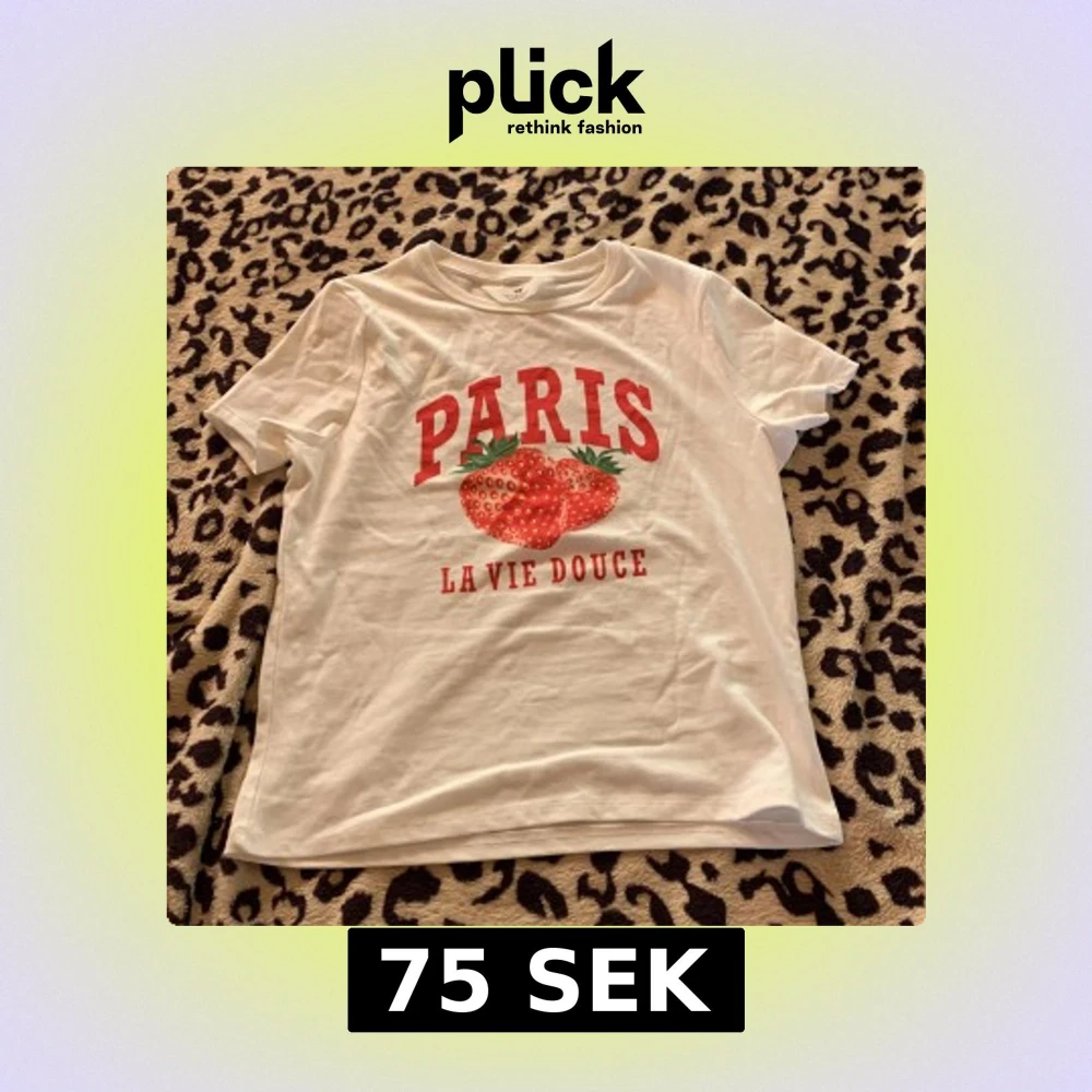 Vit t-shirt från H&M med röd text 'PARIS' och 'LA VIE DOUCE' samt tryck av två jordgubbar på bröstet. Klassisk rund hals och korta ärmar. Perfekt för dig som gillar fräscha och söta prints.
