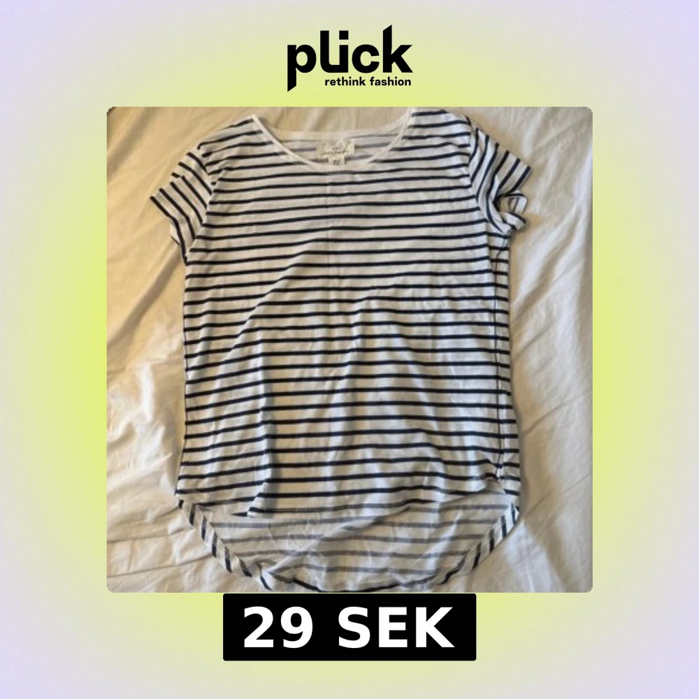 Vit t-shirt med svarta horisontella ränder från H&M. Modellen har rund hals och korta ärmar, samt en något längre och rundad nederkant bak. Perfekt för en chill och enkel stil. Materialet är mjuk bomull som känns skönt mot huden.