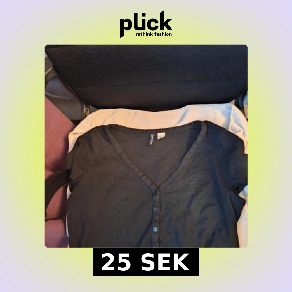 Säljer en svart T-shirt från H&M med v-ringning och knappar framtill. Perfekt för lager-på-lager och enkel att matcha med olika outfits. Ett måste i garderoben!