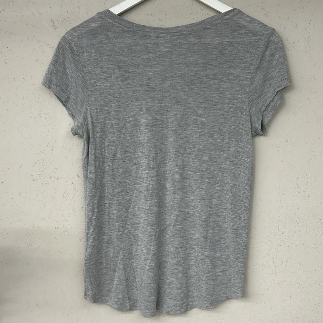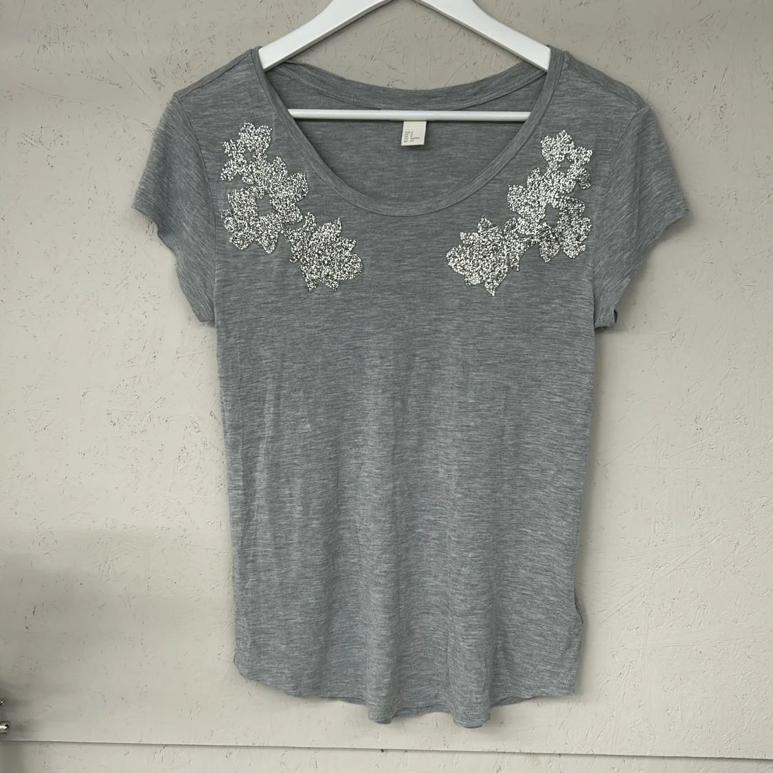 Säljer en stilren grå t-shirt från H&M med vackra spetsdetaljer på axlarna. T-shirten är kortärmad och tillverkad i mjukt material för en bekväm passform. Perfekt för en avslappnad look.