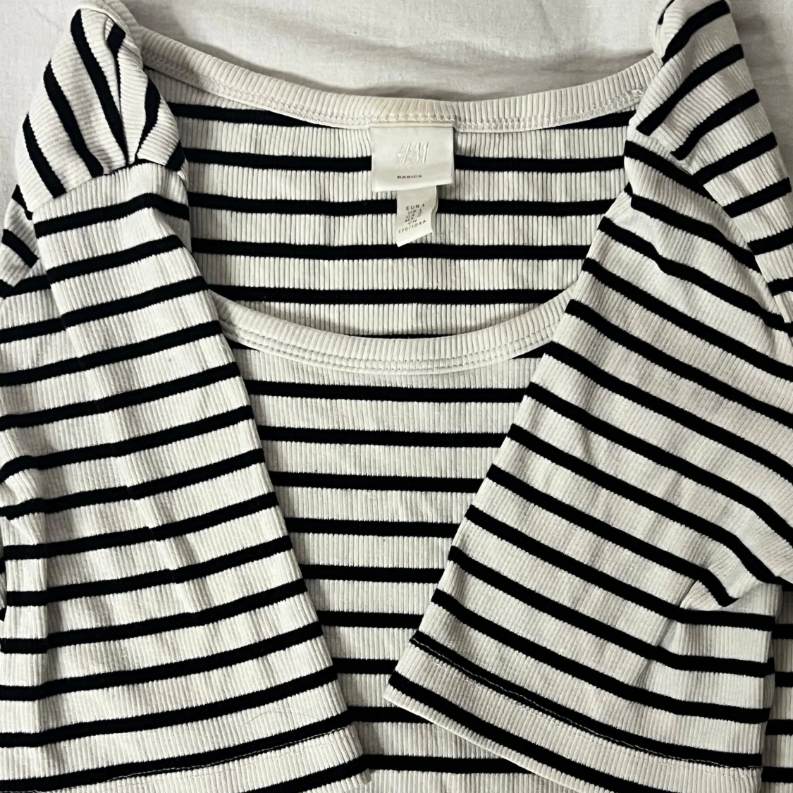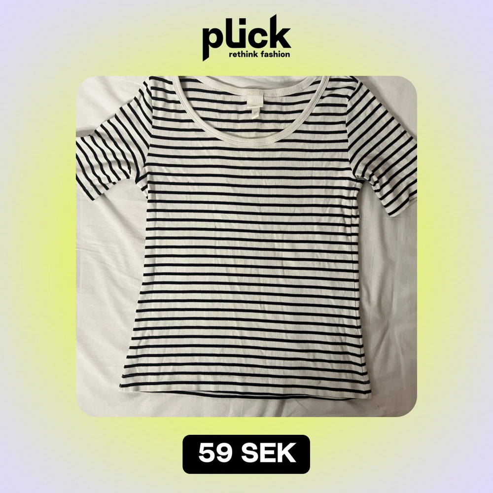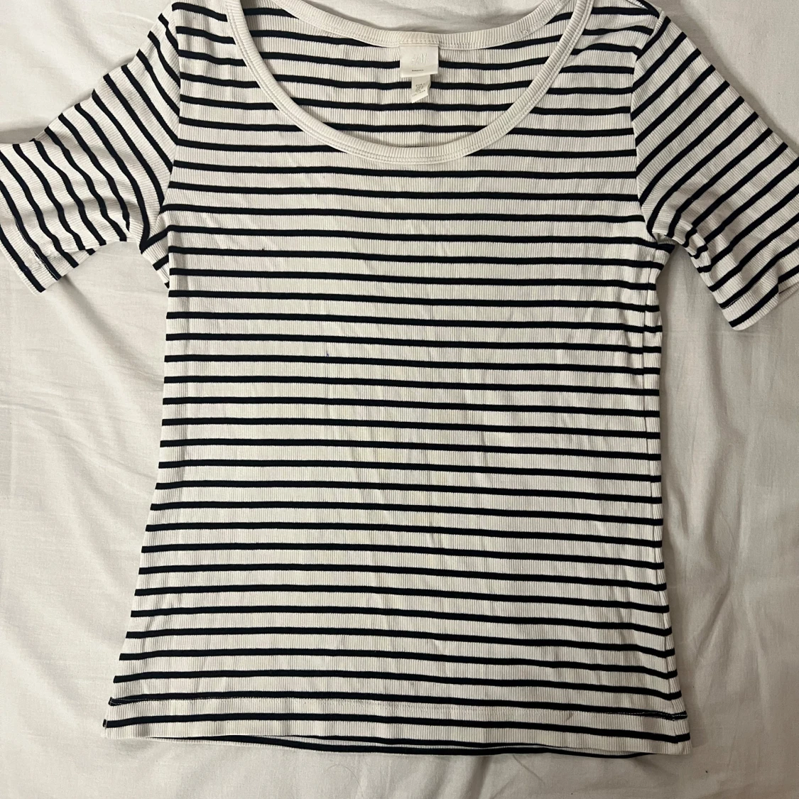 Säljer en snygg randig t-shirt från H&M i svart och vit. Den är ribbad och har korta ärmar, perfekt för en avslappnad stil. Passar bra till både jeans och kjol. Perfekt för vår och sommar!