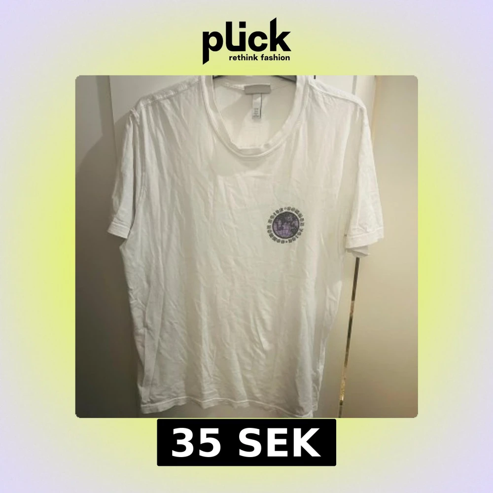 Vit t-shirt från H&M med rund hals och tryck i svart och lila på bröstet och ryggen. På ryggen står det 'COMMON NOISE COMMON VOICE' i cirklar runt en jordglob. Perfekt för en avslappnad stil.