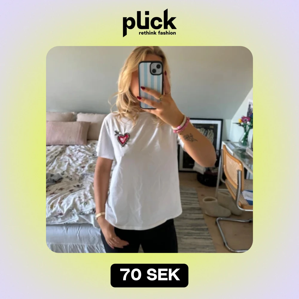 Säljer en vit t-shirt i bomull med en cool hjärtdetalj på bröstet. T-shirten har korta ärmar och en normal passform❤️