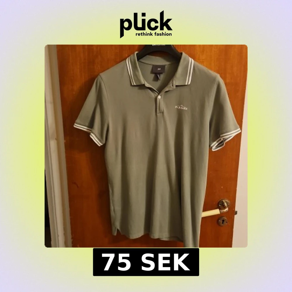Snygg grön pikétröja från H&M med vita ränder på krage och ärmslut. Klassisk polokrage med två knappar och broderad text 'Les Plaisirs' på bröstet. Perfekt för en chill och stilren look.