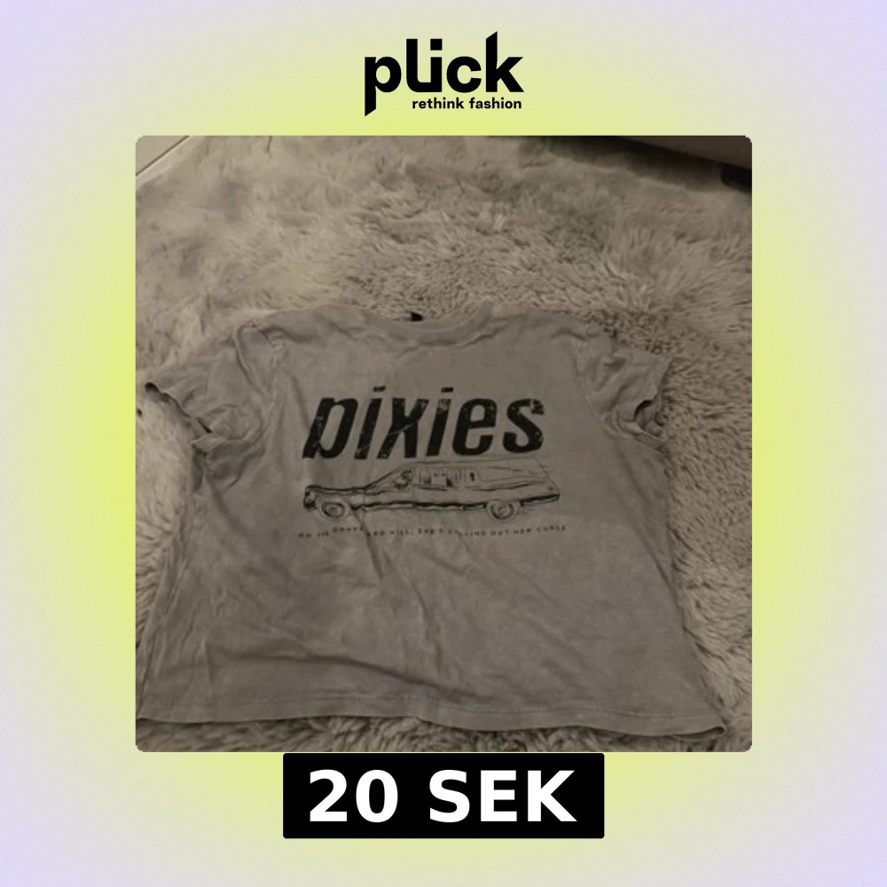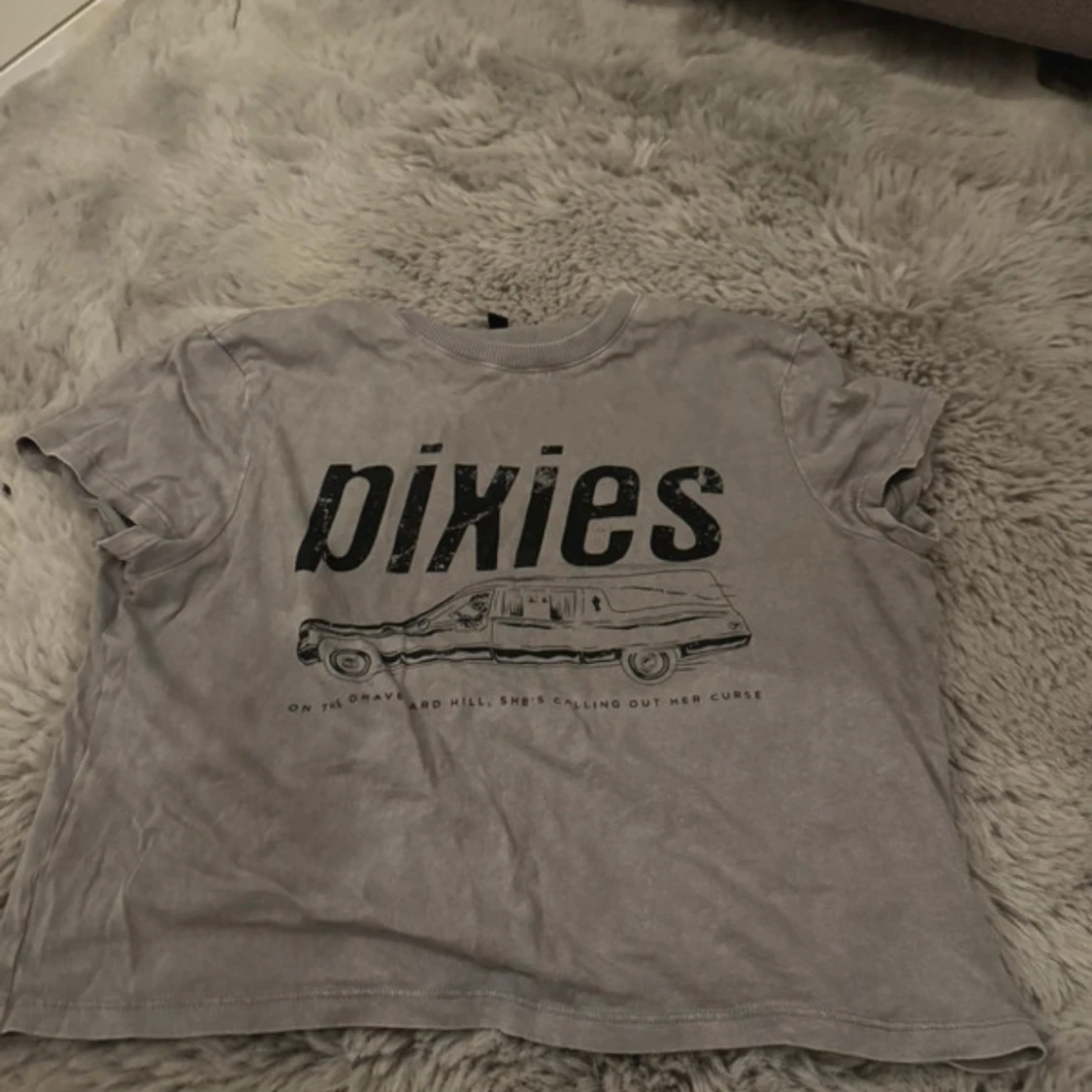 Säljer en grå t-shirt med stort Pixies-tryck och motiv av en bil på framsidan. T-shirten har korta ärmar och en klassisk rund hals. Storlek M från H&M
