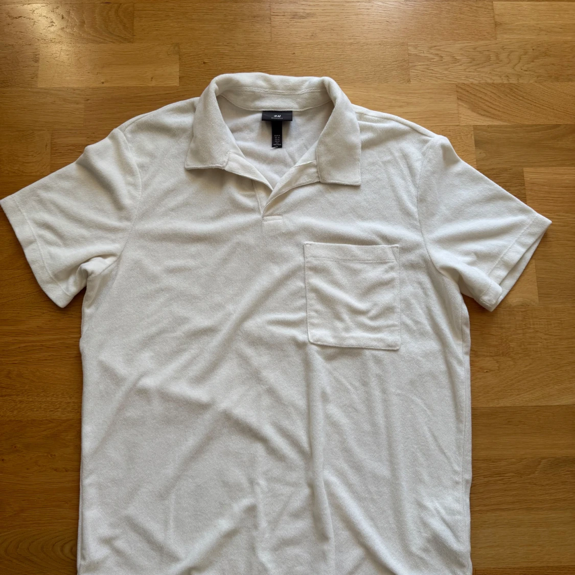 Vit piké t-shirt från H&M i regular fit. T-shirten har klassisk krage, korta ärmar och en bröstficka. Tillverkad i frotté material. Perfekt för en clean och stilren look.