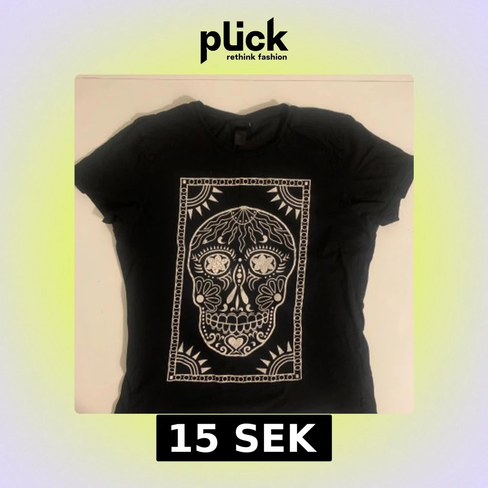 Cool svart t-shirt från H&M med ett stort vitt dödskalletryck på framsidan. Perfekt för en edgy look. T-shirten har korta ärmar och en rund halsringning.