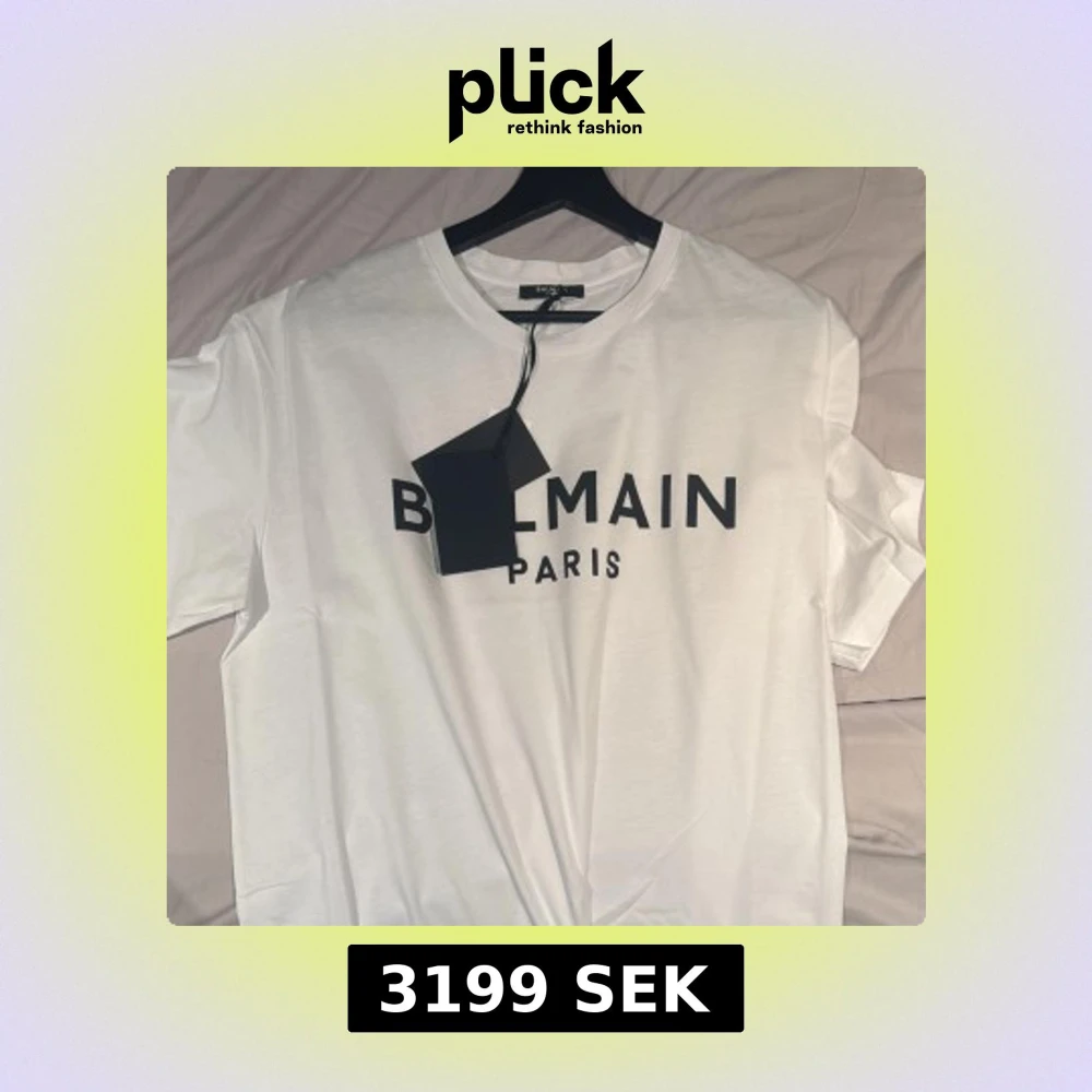Säljer en stilren vit t-shirt från Balmain med svart texttryck 'BALMAIN PARIS' på framsidan. T-shirten är kortärmad och tillverkad i mjukt material för en bekväm passform. Perfekt för en varm sommar dag . Helt ny och aldrig använd , köpt för 400 euros vilket motsvarar 4799 kr , mitt pris 3199