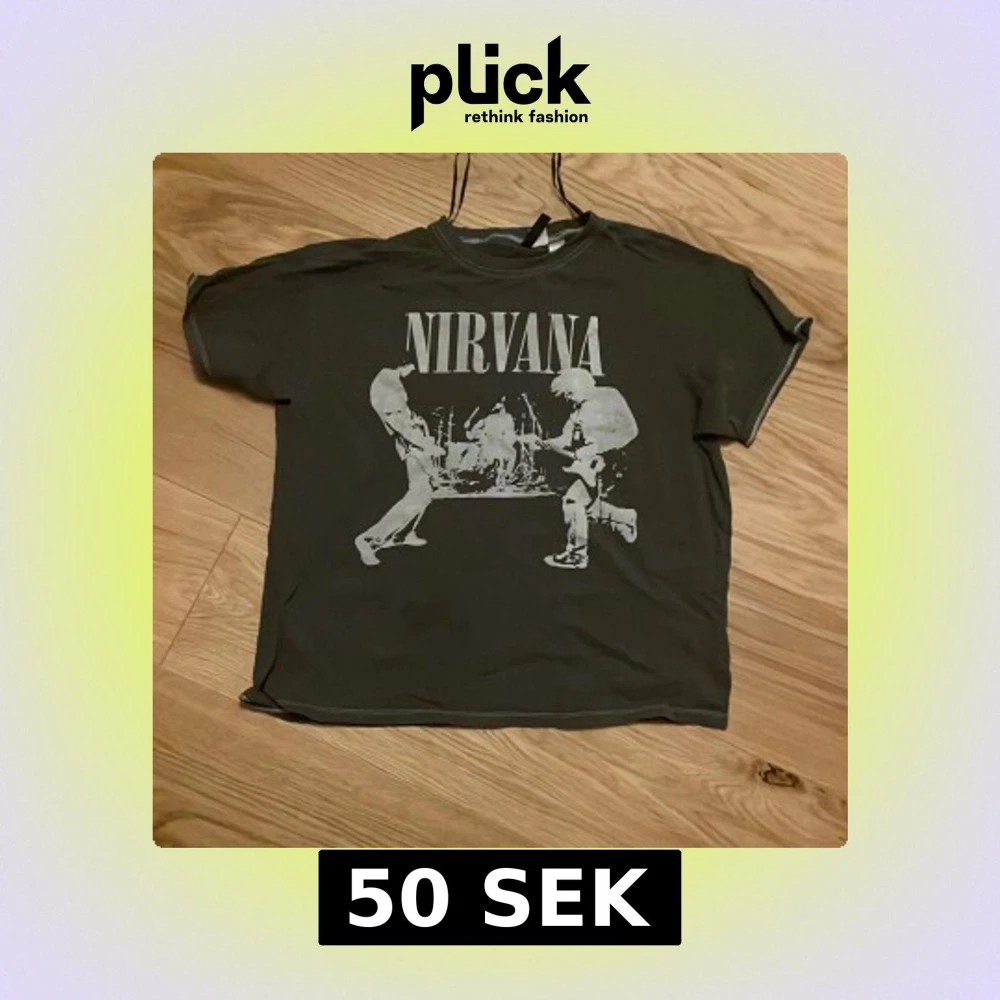 Cool grå t-shirt med Nirvana-tryck i vitt. T-shirten har ett rockigt motiv med bandmedlemmar i aktion. Perfekt för fans av klassisk grunge. Kortärmad och i normal passform. Tröjan har lite fläckar som knappt är synliga för ögat.