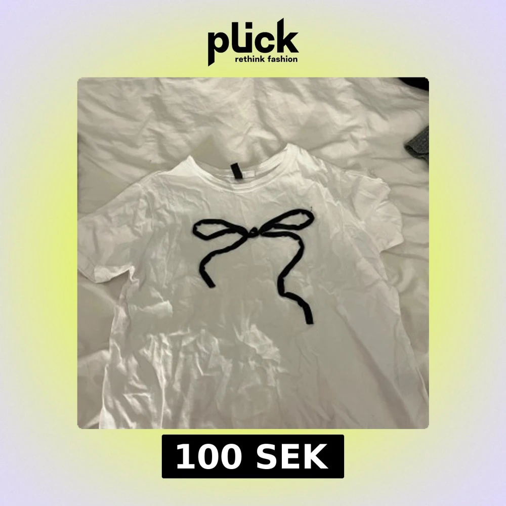 Hej! Säljer nu min vita t-shirt från H&M i storlek S med en svart rosett framtill (passar också XS). Klassisk rund hals och korta ärmar. Säljer då den inte används, använd 2-3 ggr💞💞