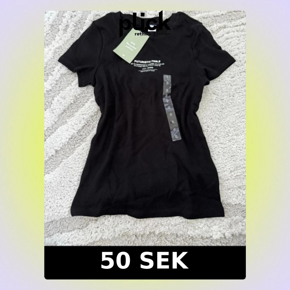 Snygg svart ribbad t-shirt från H&M med trycket 'FUTURISTIC FEELS' och text framtill. Tillverkad av 25% återvunnen bomull. Klassisk rund hals och korta ärmar, perfekt för en trendig och avslappnad stil.