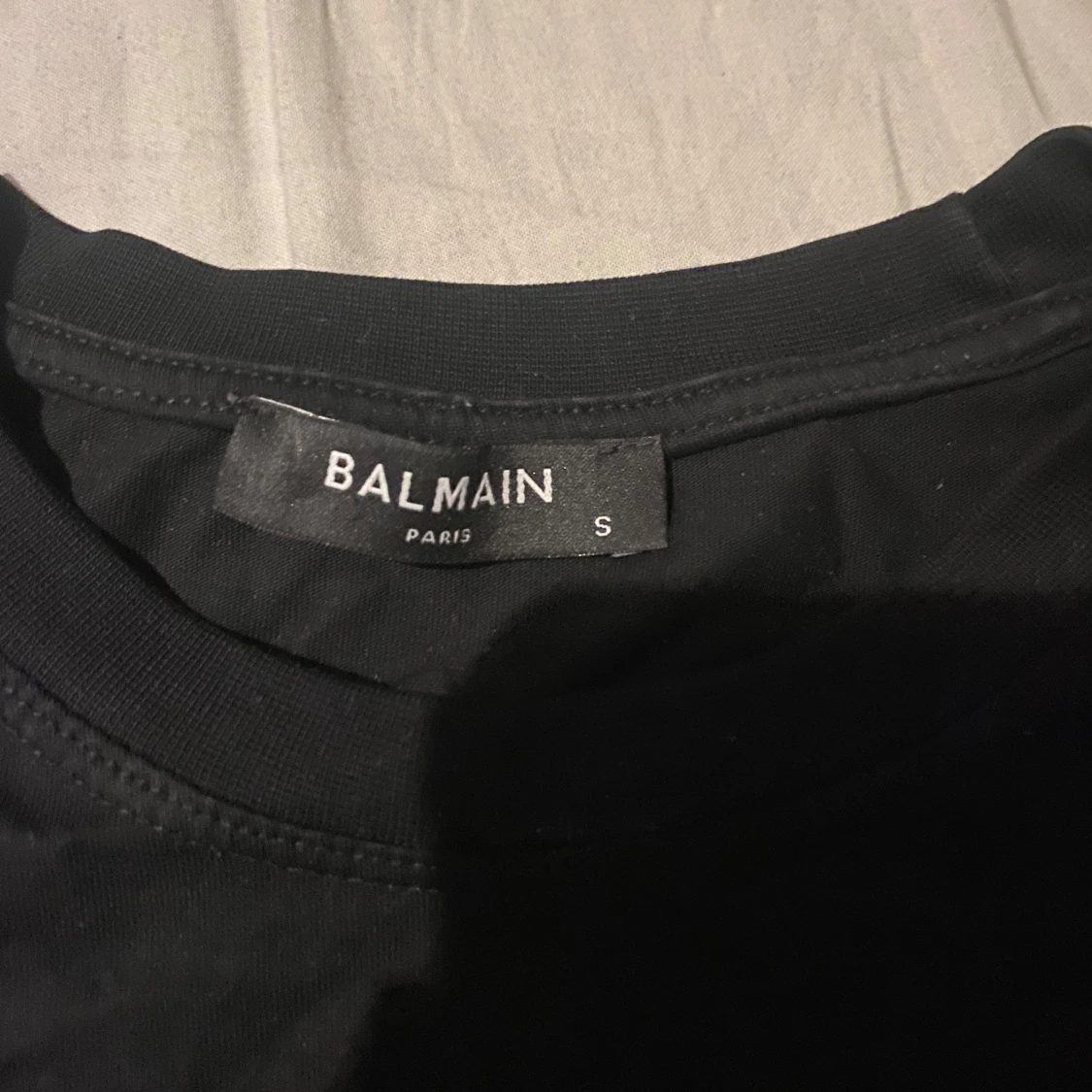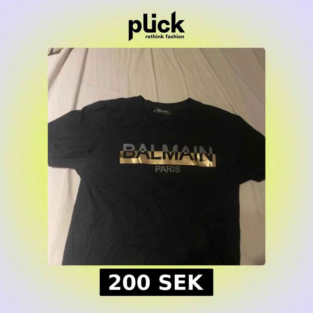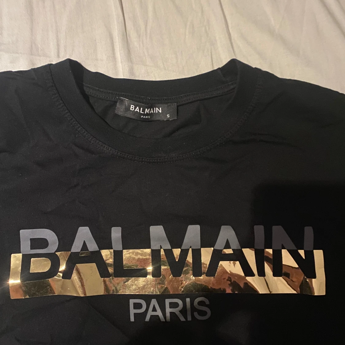 Svart t-shirt från Balmain med klassisk rund hals och korta ärmar. Framsidan har ett stort Balmain Paris-tryck med en glansig guldremsa som ger en lyxig vibe. Materialet känns mjukt och skönt, perfekt för dig som gillar designerplagg med statement. Bra skick, pris kan diskuteras!