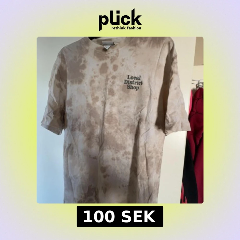Snygg beige tie-dye t-shirt från H&M med avslappnad passform. Tryck med 'Local District Shop' fram och stort tryck bak. Skön bomullskvalitet och klassisk rund hals. Perfekt för en chill och trendig look.