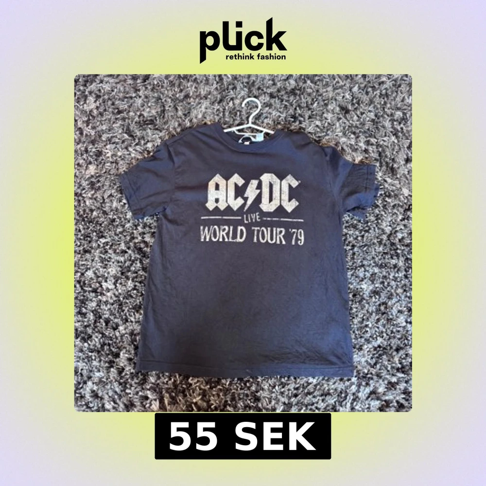 Svart t-shirt från H&M med AC/DC-tryck och texten 'Live World Tour '79' på bröstet. Klassisk rund hals och korta ärmar. Mjuk bomullskvalitet som är skön att bära. Perfekt för dig som gillar bandtröjor och vill ha en cool, avslappnad stil.