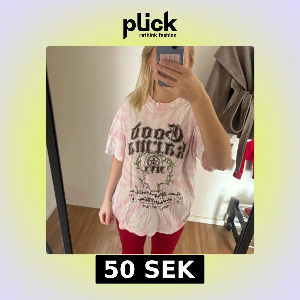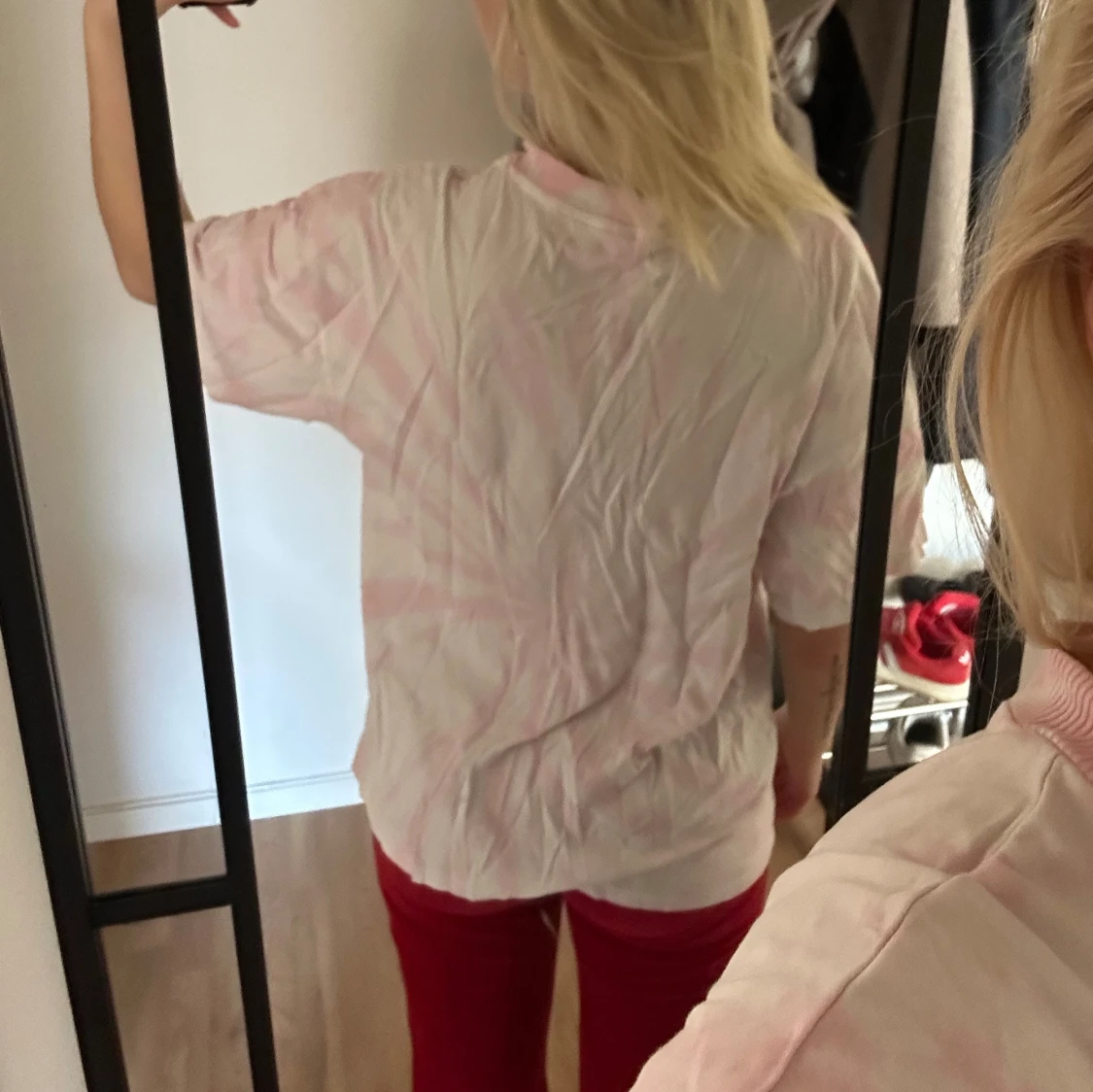 Säljer en oversized t-shirt i ljusrosa och vitt med coolt grafiskt tryck framtill. T-shirten har korta ärmar, rund hals och ett unikt mönster som ger en avslappnad vibe. Perfekt för dig som gillar streetstyle och bekväma plagg.