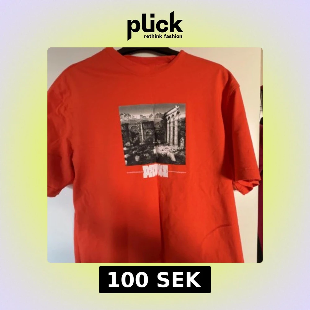Snygg orange t-shirt från H&M med relaxed fit och coolt svartvitt tryck framtill som föreställer ruiner och texten 'REFUSE'. Klassisk rund hals och korta ärmar, perfekt för en chill och trendig look.