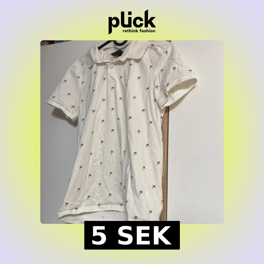 Vit pikétröja från H&M i slim fit med små svarta palmmönster över hela tröjan. Klassisk krage och korta ärmar, perfekt för sommaren. Tillverkad i 100% bomull för en skön och luftig känsla.