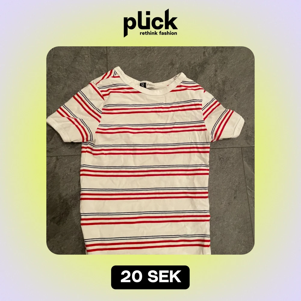 Säljer en fräsch randig t-shirt från H&M i vitt med röda och blå ränder. Perfekt för en avslappnad stil. T-shirten är kortärmad och gjord i mjuk bomull. Passar bra till både jeans och shorts!