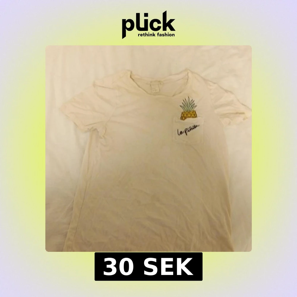 Vit t-shirt från H&M i bomull, med korta ärmar och bröstficka. På fickan står det 'la piña' och ovanför är en broderad ananas i gult och grönt. Perfekt för dig som gillar roliga detaljer och somrig vibe.