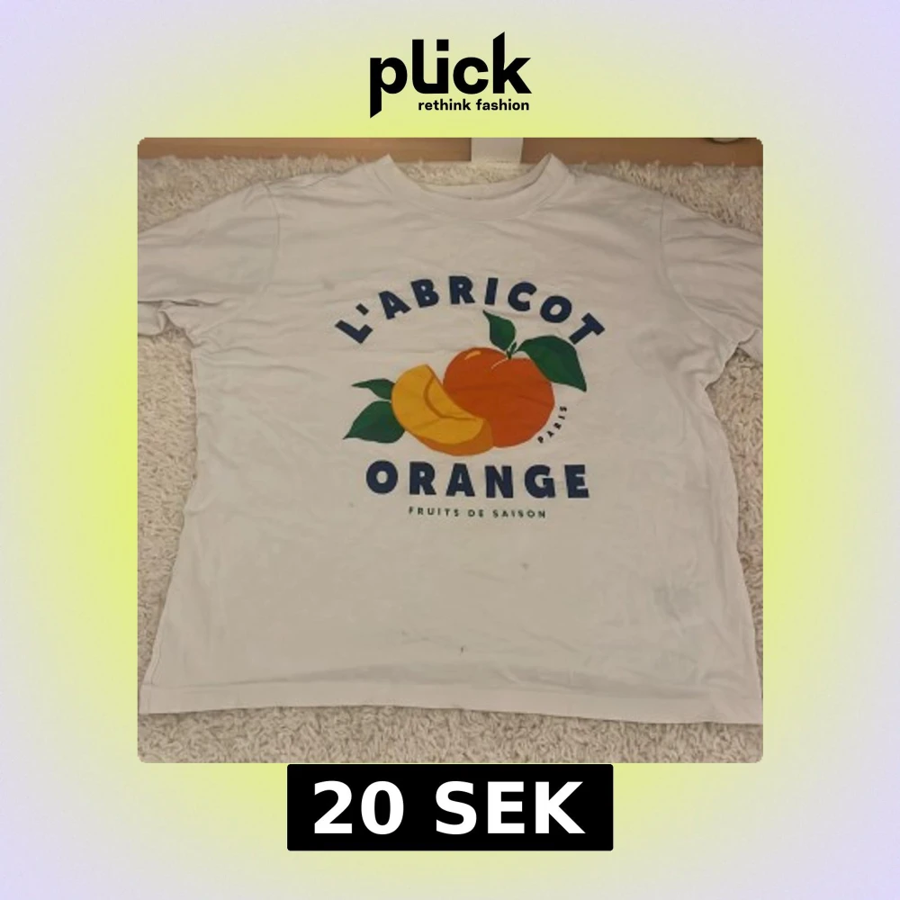 Säljer en vit t-shirt med tryck av en apelsin. T-shirten har korta ärmar och en rund halsringning. Har en lite fläck. Tröjan tvättas innan den skickas (Den är lite smutsig). Den kommer inte till användning länge. Men T-shirten är i bra skick och går att använda. 💕💕
