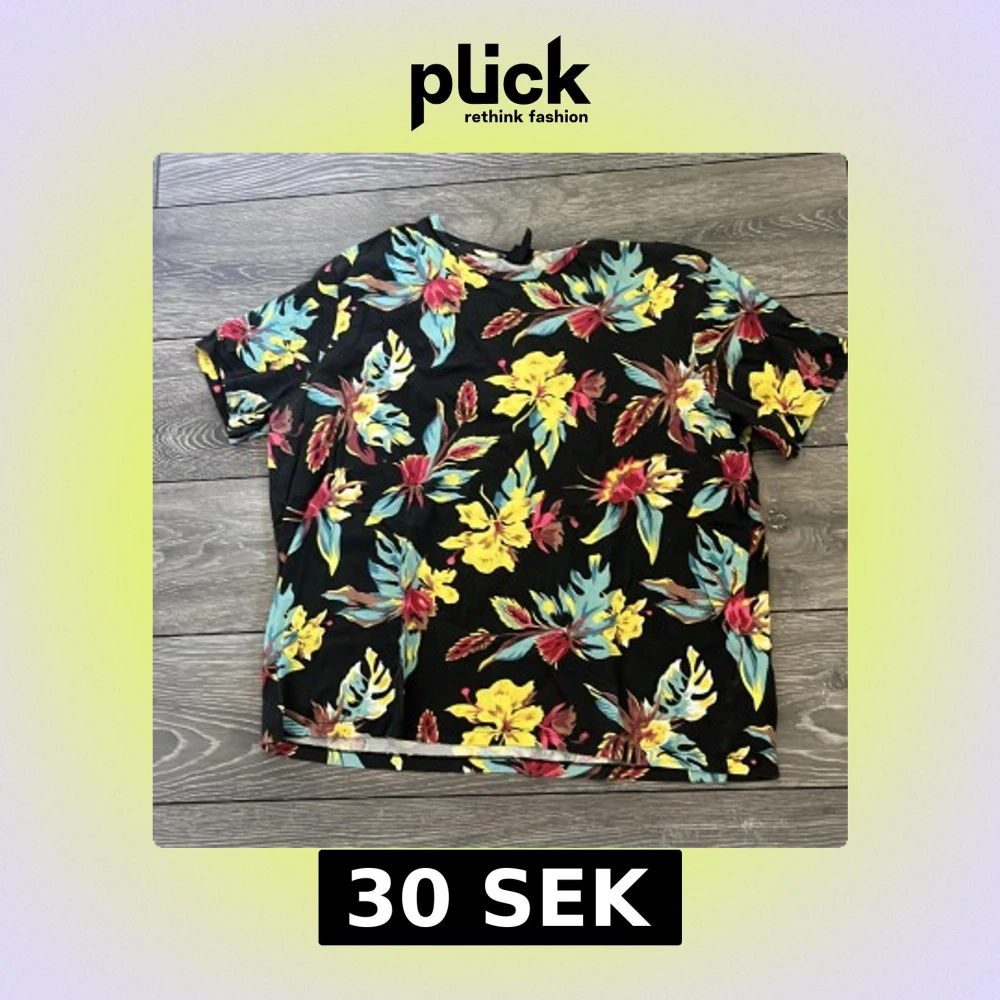 Färgstark t-shirt med svart bas och stora blommiga tryck i gult, blått och rött. Modellen är kortärmad och har en avslappnad passform. Perfekt för dig som vill sticka ut med en tropisk vibe. Materialet känns mjukt och svalt, troligen bomull eller polyester.