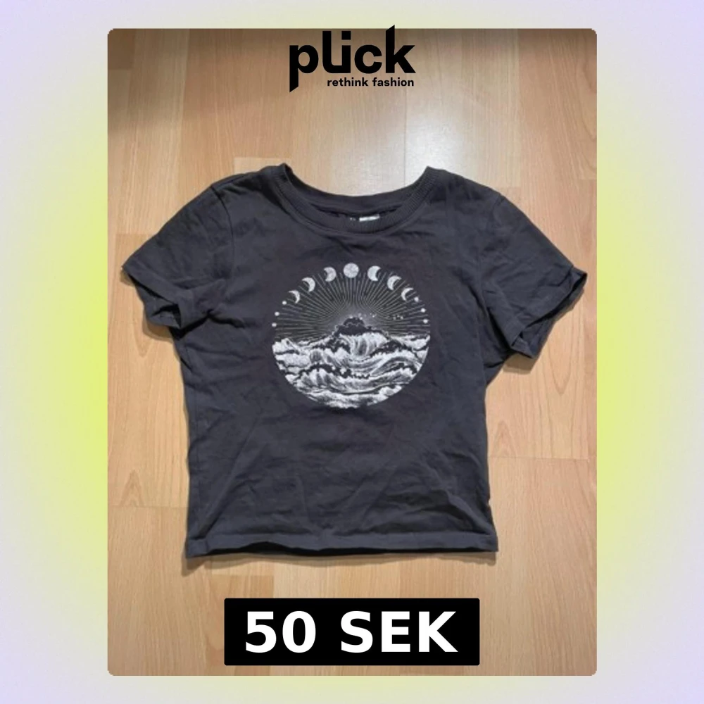 Svart t-shirt från H&M med ett stort tryck på bröstet som visar månfaser och vågor i vitt. T-shirten är croppad och har rund hals samt korta ärmar.