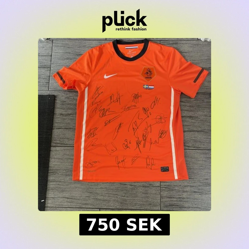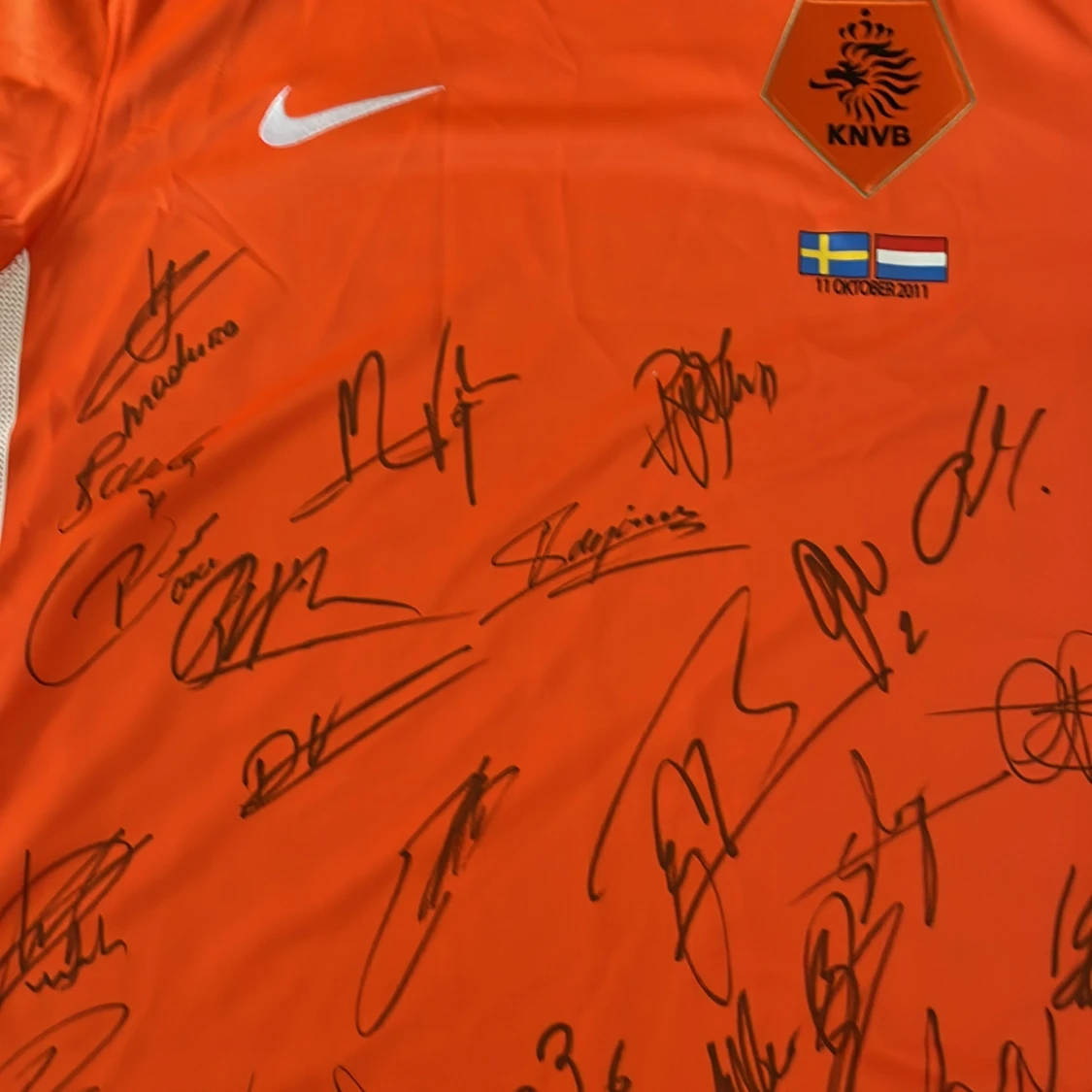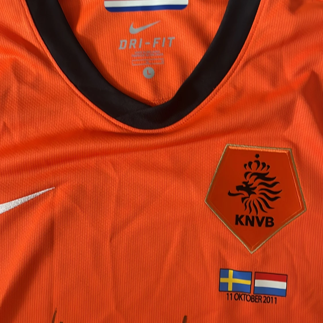 Säljer en orange officiell Holland fotbollströja från Nike, storlek L, med svarta detaljer och KNVB-emblem på bröstet. Tröjan har korta ärmar, Dri-FIT-material och är signerad av flera spelare. Matchdetaljer mot Sverige 11 oktober 2011 tryckt på framsidan.