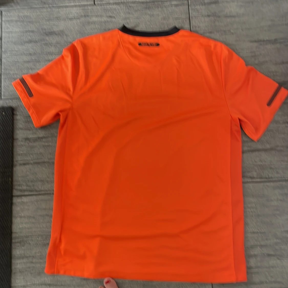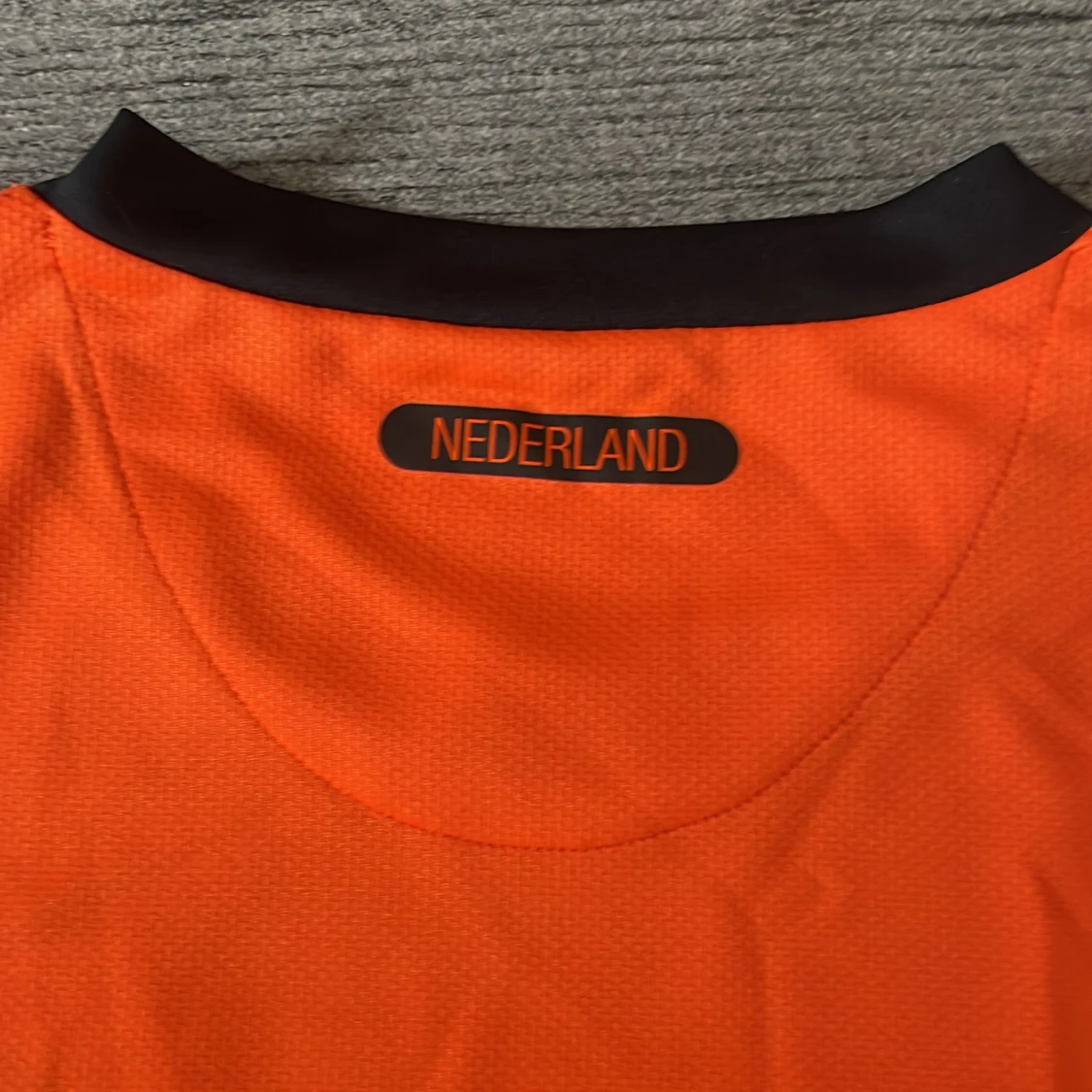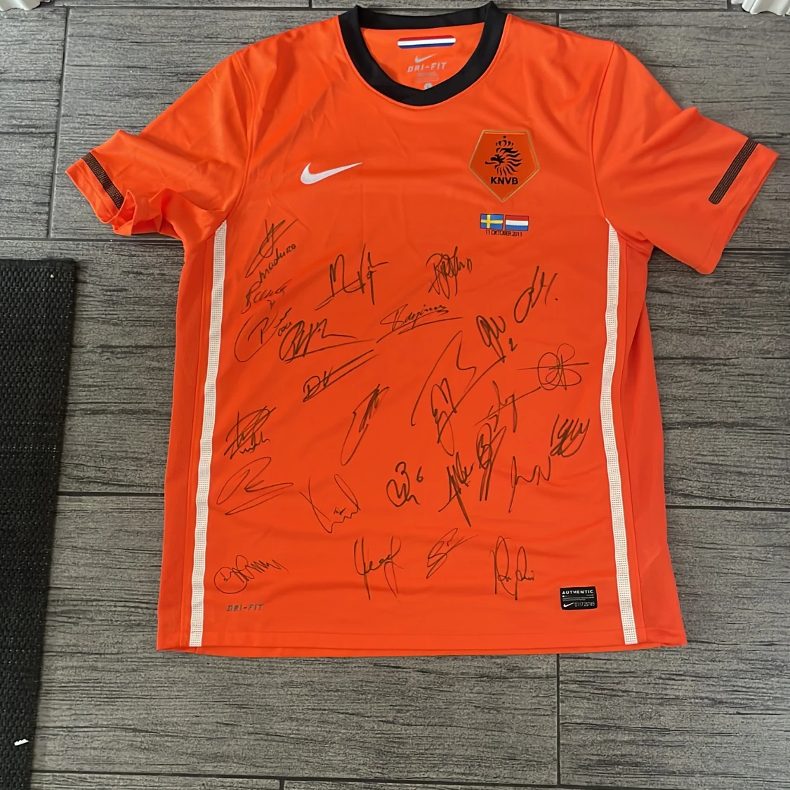 Säljer en orange officiell Holland fotbollströja från Nike, storlek L, med svarta detaljer och KNVB-emblem på bröstet. Tröjan har korta ärmar, Dri-FIT-material och är signerad av flera spelare. Matchdetaljer mot Sverige 11 oktober 2011 tryckt på framsidan.