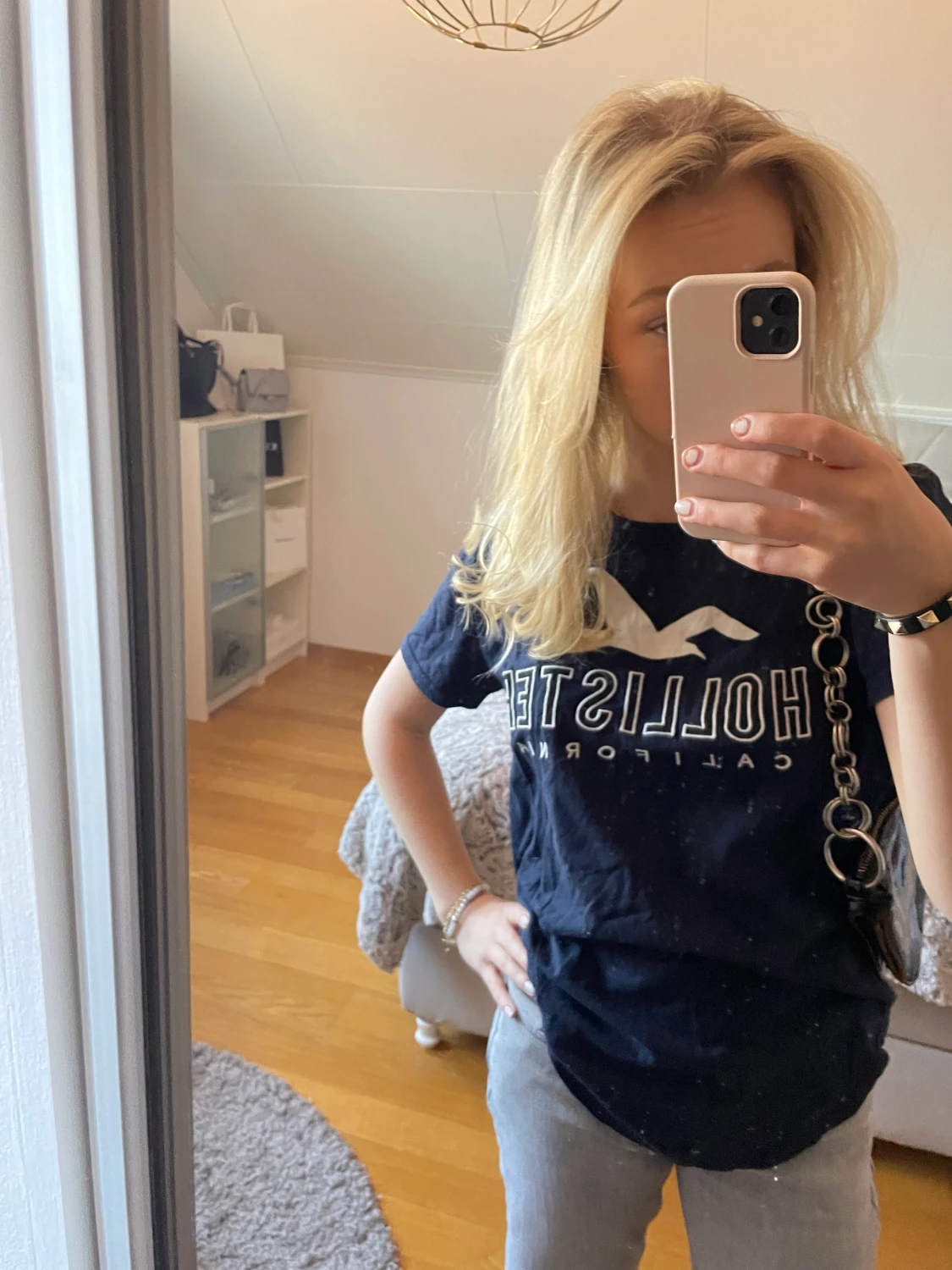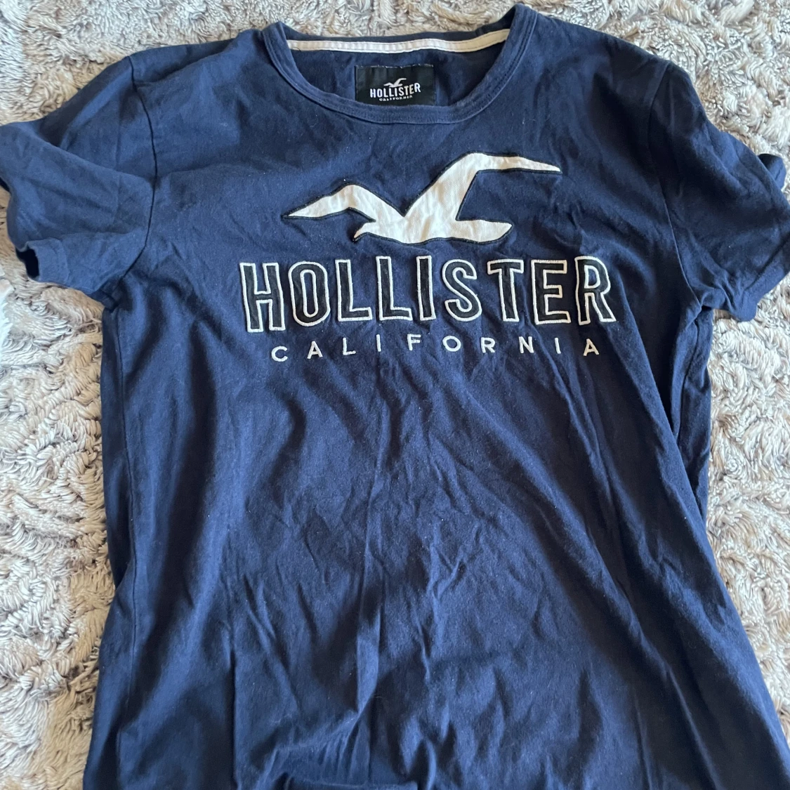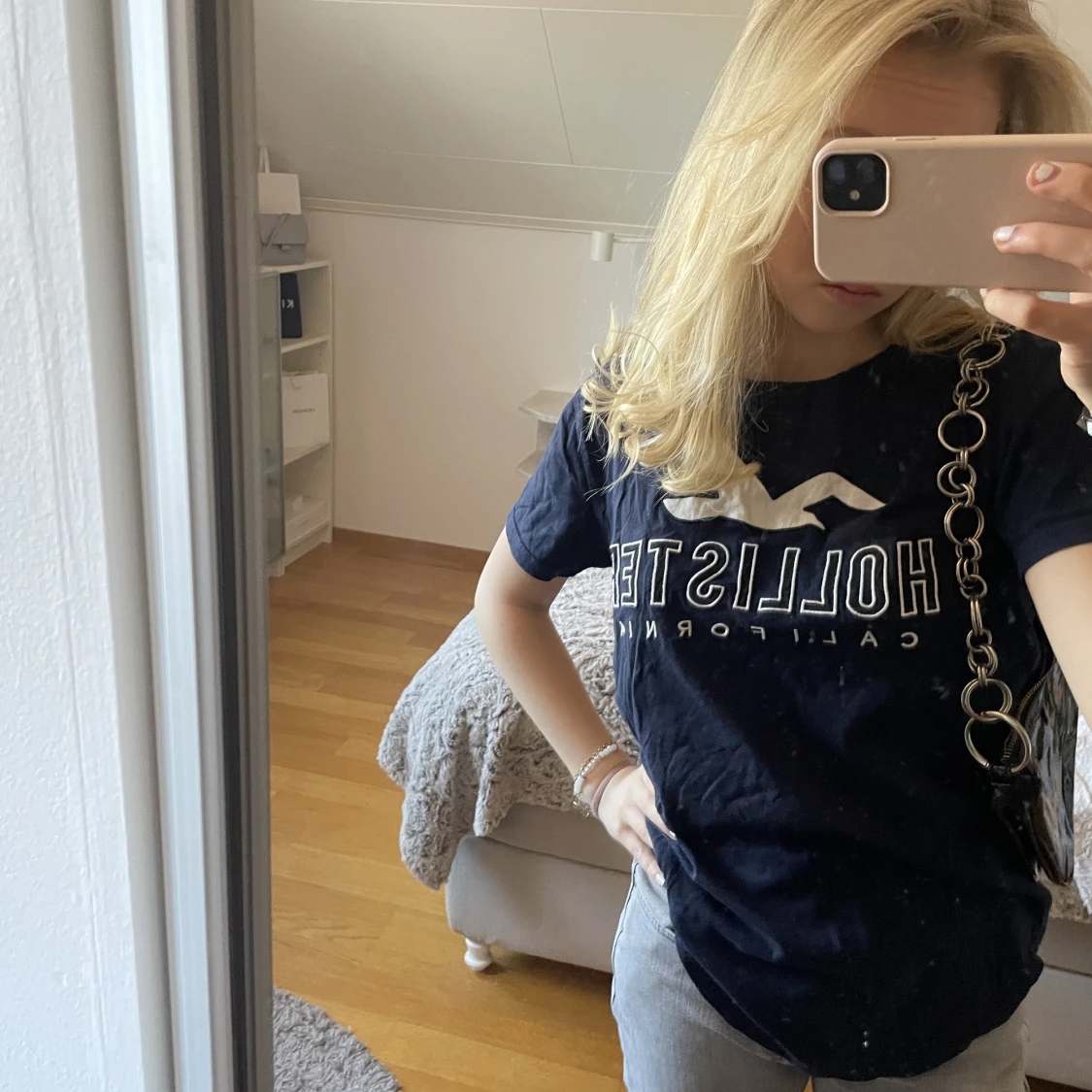 Tryck gärna på ”KÖP NU”. Nästintill oanvänd t-shirt från hollister i marinblått💙storlek XS men stor i storleken så den är mer som en M.