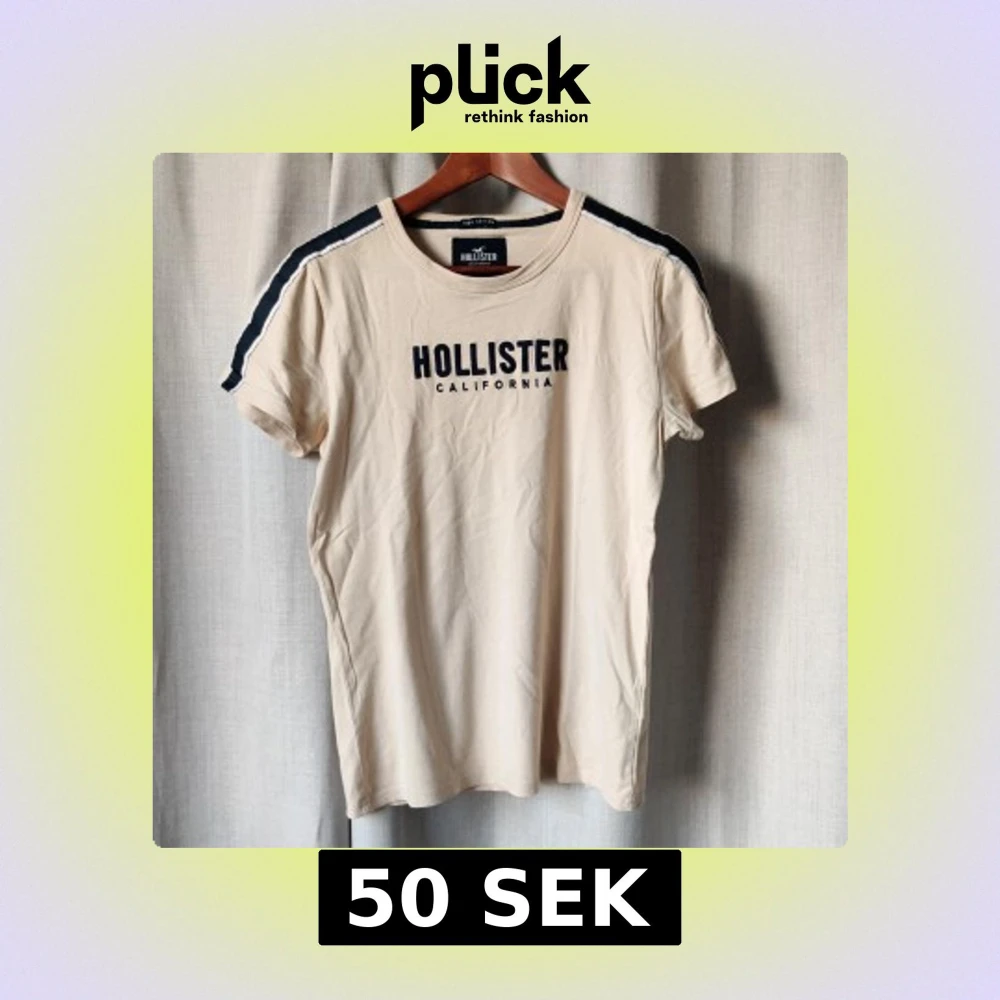 Snygg beige t-shirt från Hollister med svart tryck 'HOLLISTER CALIFORNIA' på bröstet. T-shirten har svarta och vita ränder längs axlarna och är tillverkad i 100% bomull. Klassisk rund hals och korta ärmar, perfekt för en chill och avslappnad stil.