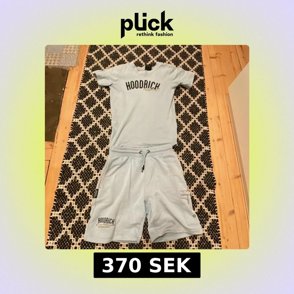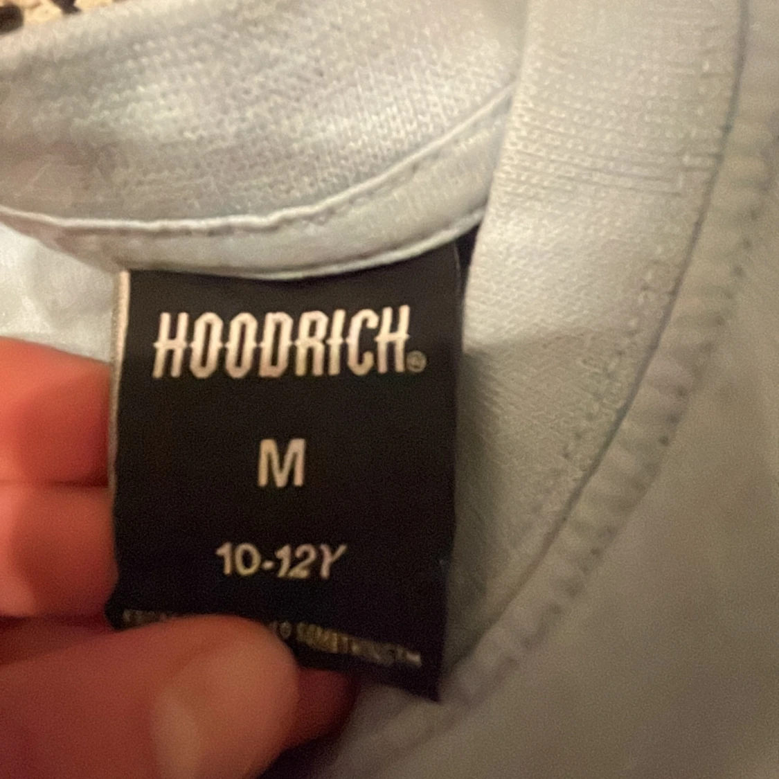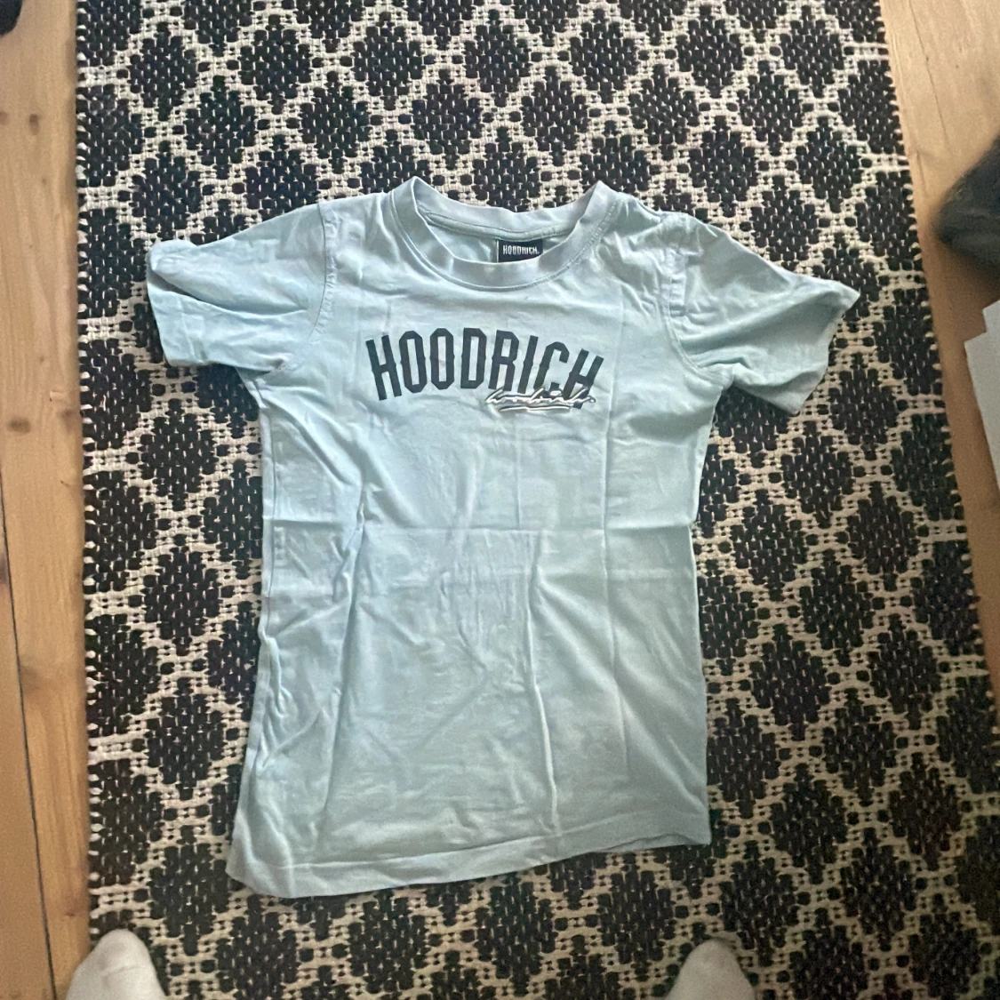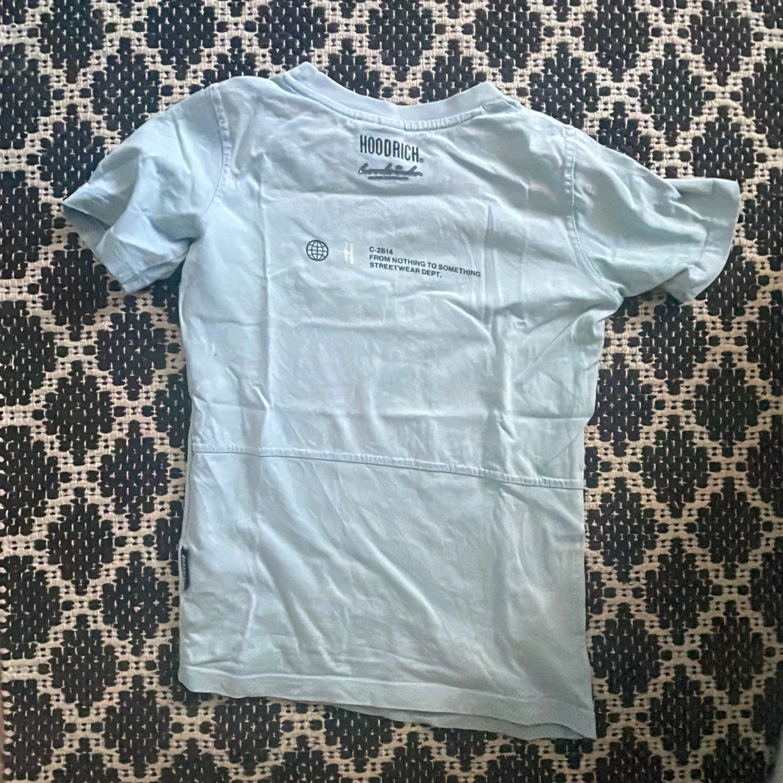 Säljer en ljusblå t-shirt från Hoodrich med tryck på bröstet. T-shirten är kortärmad och har en avslappnad passform. Perfekt för en casual look. Passar personen mellan 145 till 158