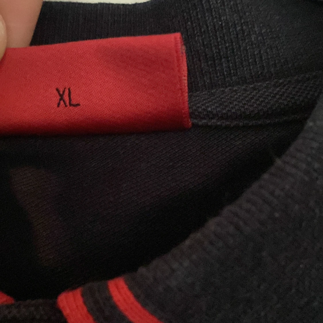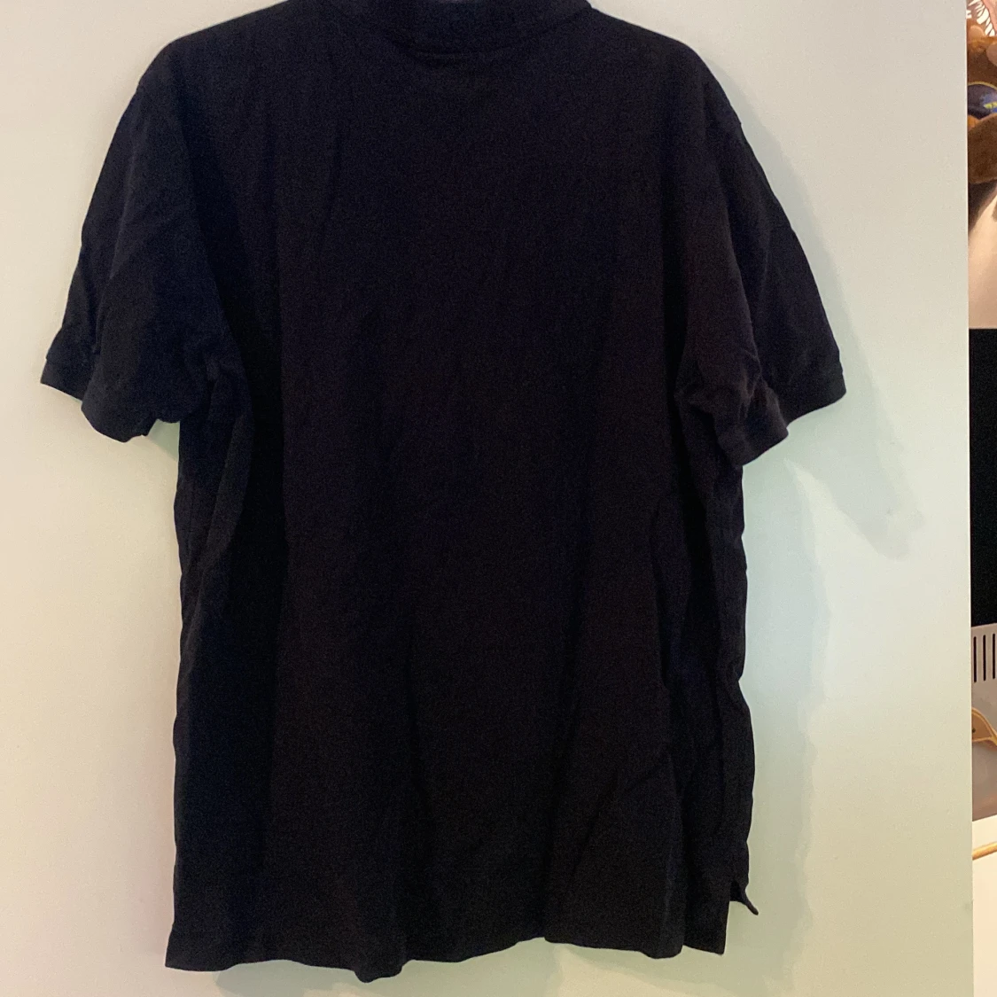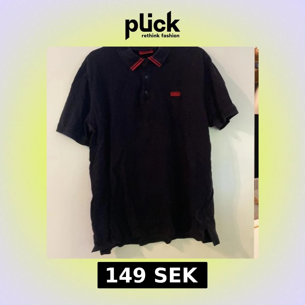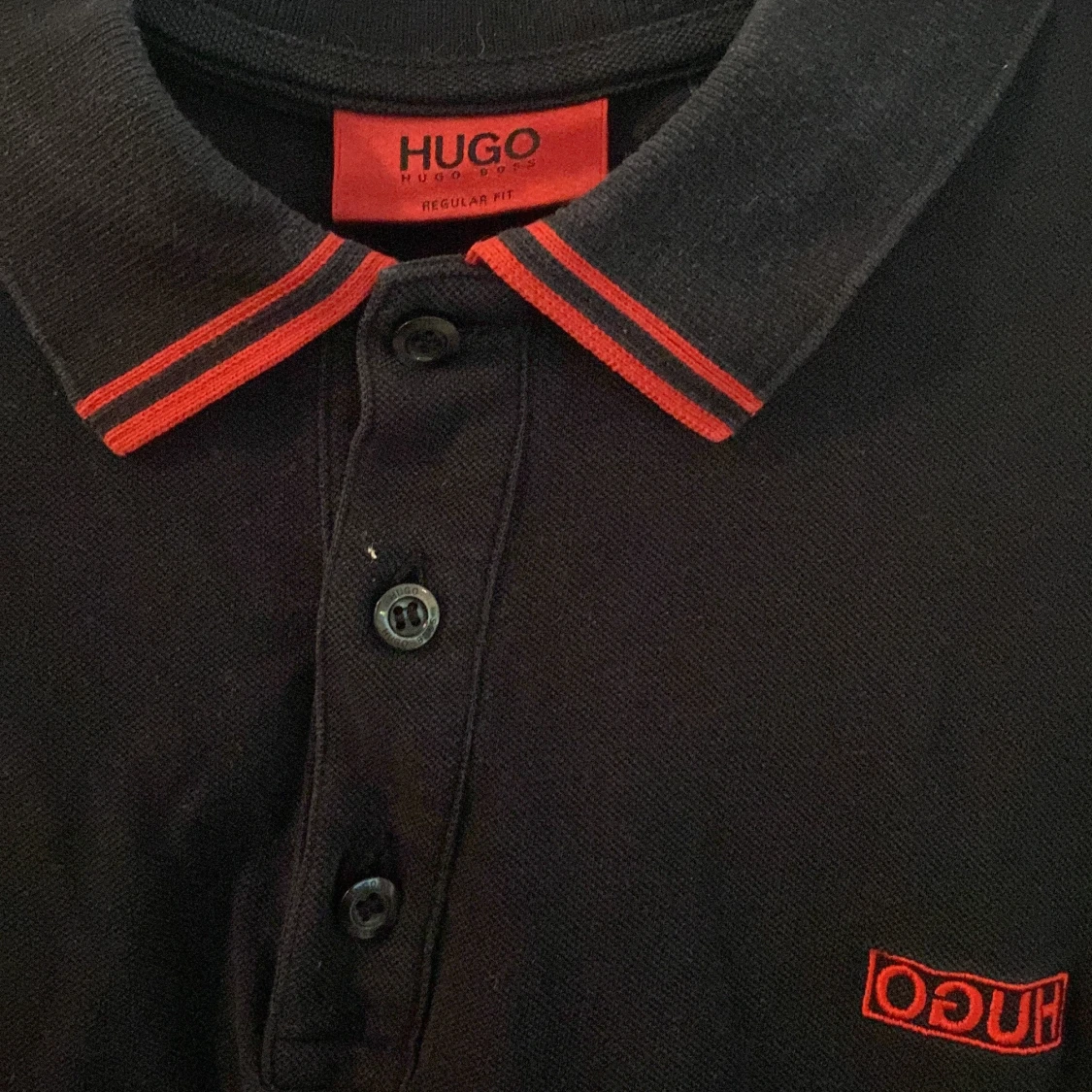 Säljer en svart pikétröja från Hugo Boss med röda detaljer på kragen och röd broderad logga på bröstet. Tröjan har klassisk krage med knappar och är kortärmad. Perfekt för en stilren look.