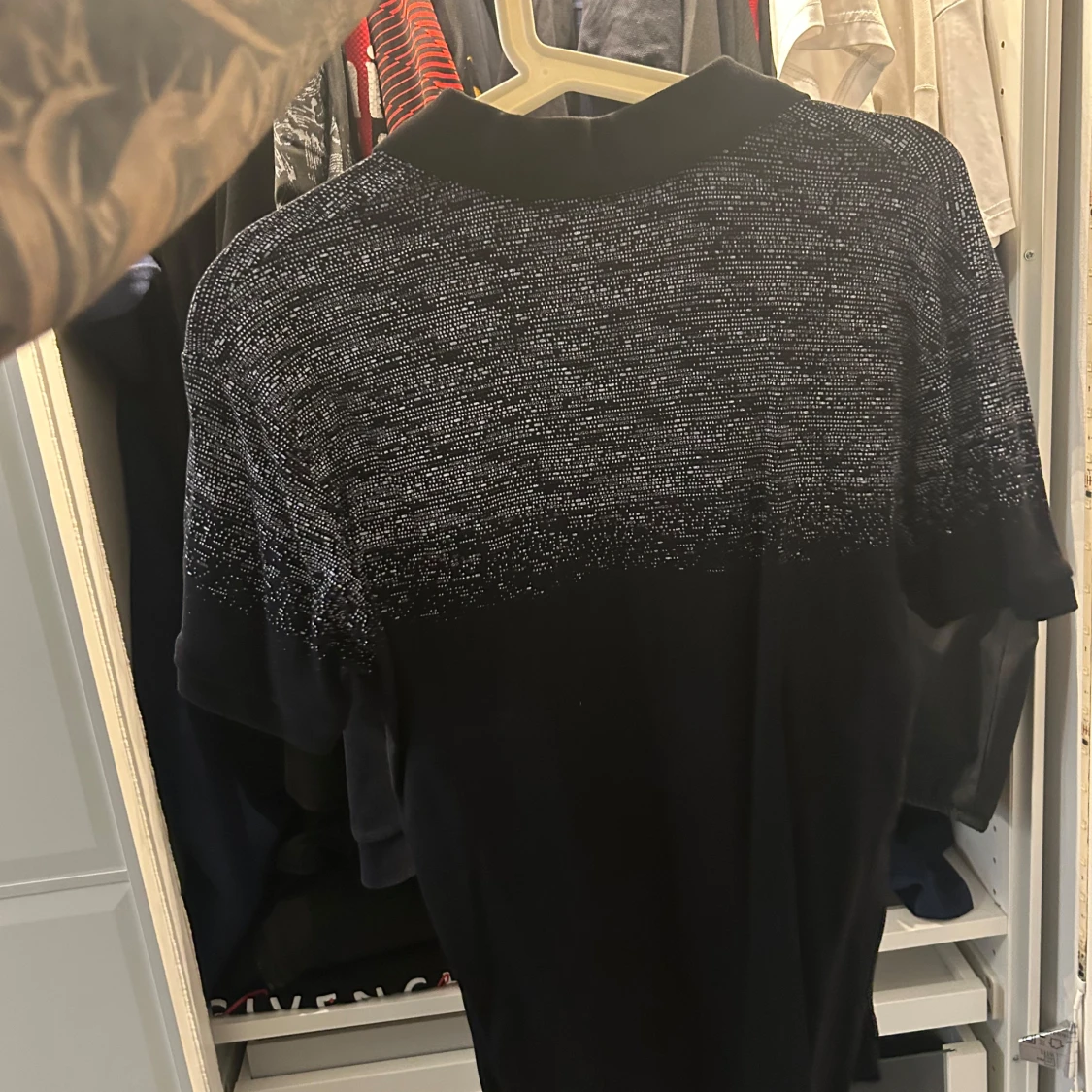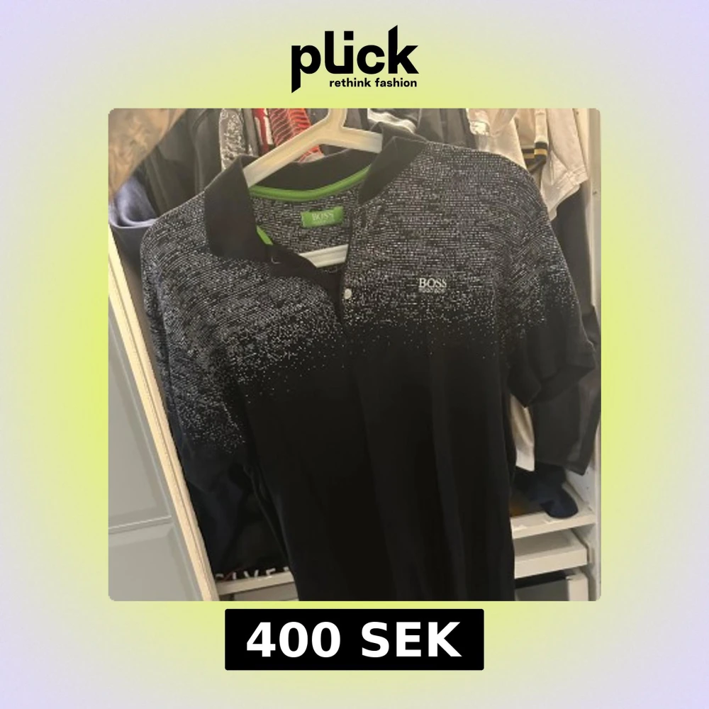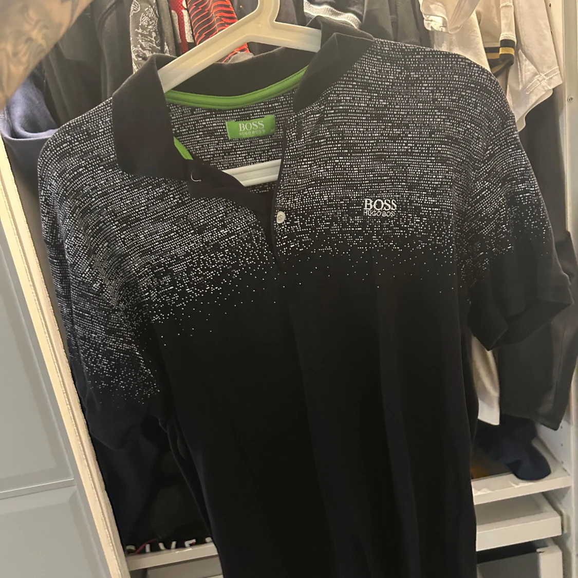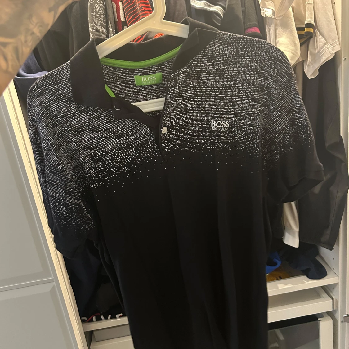 Svart t-shirt från Hugo Boss med vit pixelmönstrad överdel och klassisk krage. T-shirten har korta ärmar, två knappar vid halsen och Boss-logga på bröstet. Insidan av kragen har en grön detalj som ger extra edge. Perfekt för dig som gillar stilren design med twist.
